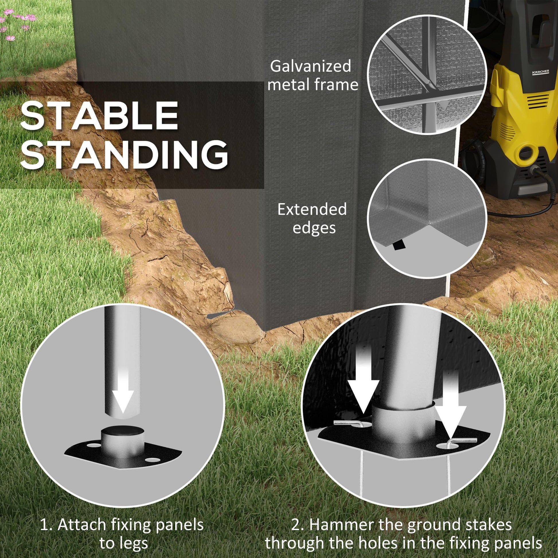 Lasting Construction: Constructed with thick galvanized steel, our heavy-duty storage tent resists cracking, peeling, and damage from water. For enhanced stability and protection, bury the extended edges and secure the shed to soft ground using the included stakes.