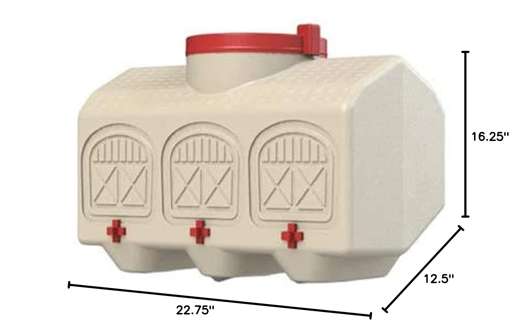 POWER CORD ACCESS PORT: The unique access port for power cords prevents freezing with optional accessories, such as de-icers and circulation pumps (sold separately). The innovative opening allows easy access for power cords to be able to keep your chicken’s water clean and ready to drink. DIMENSIONS: 22 3/4" L X 12 1/2" D X 16 1/4" H