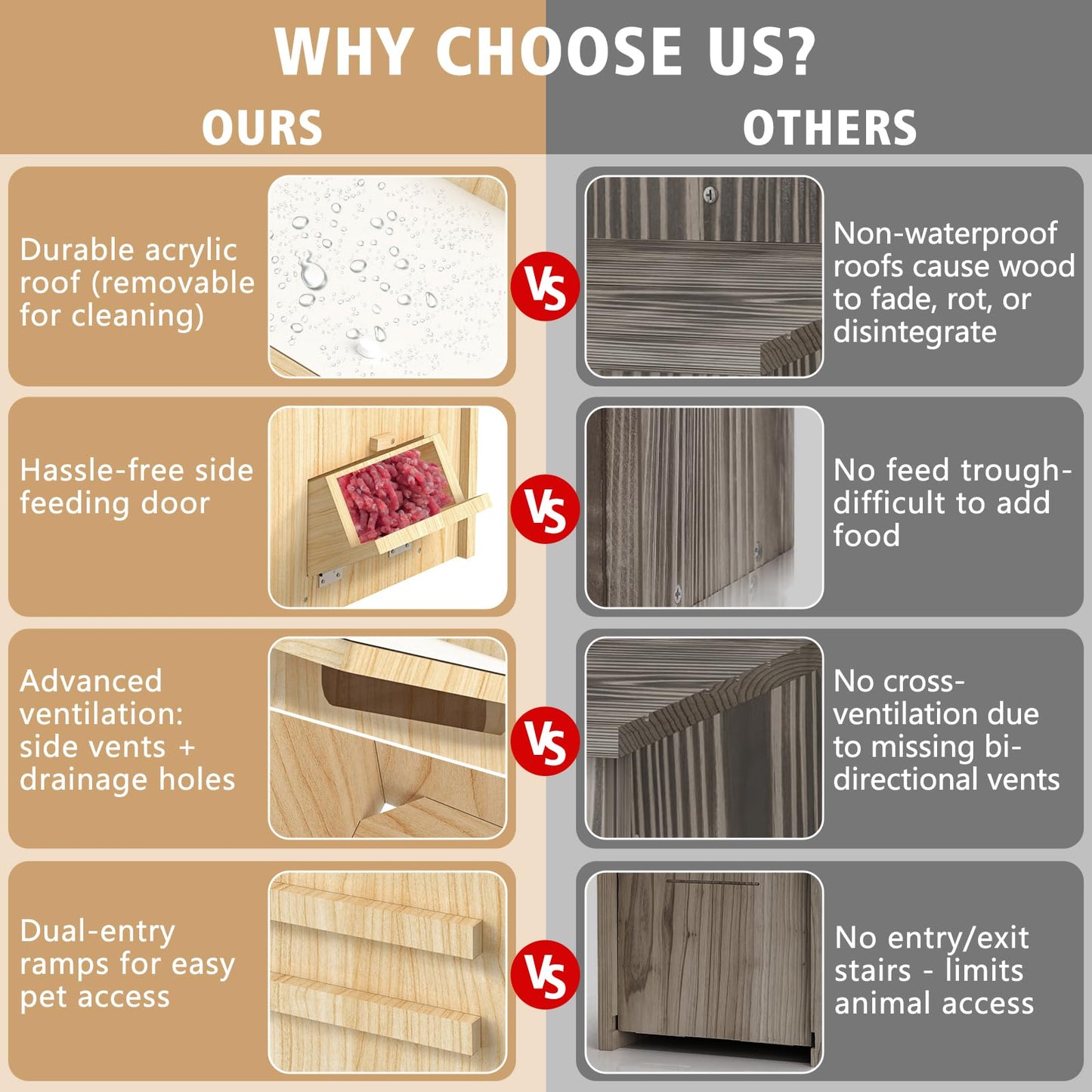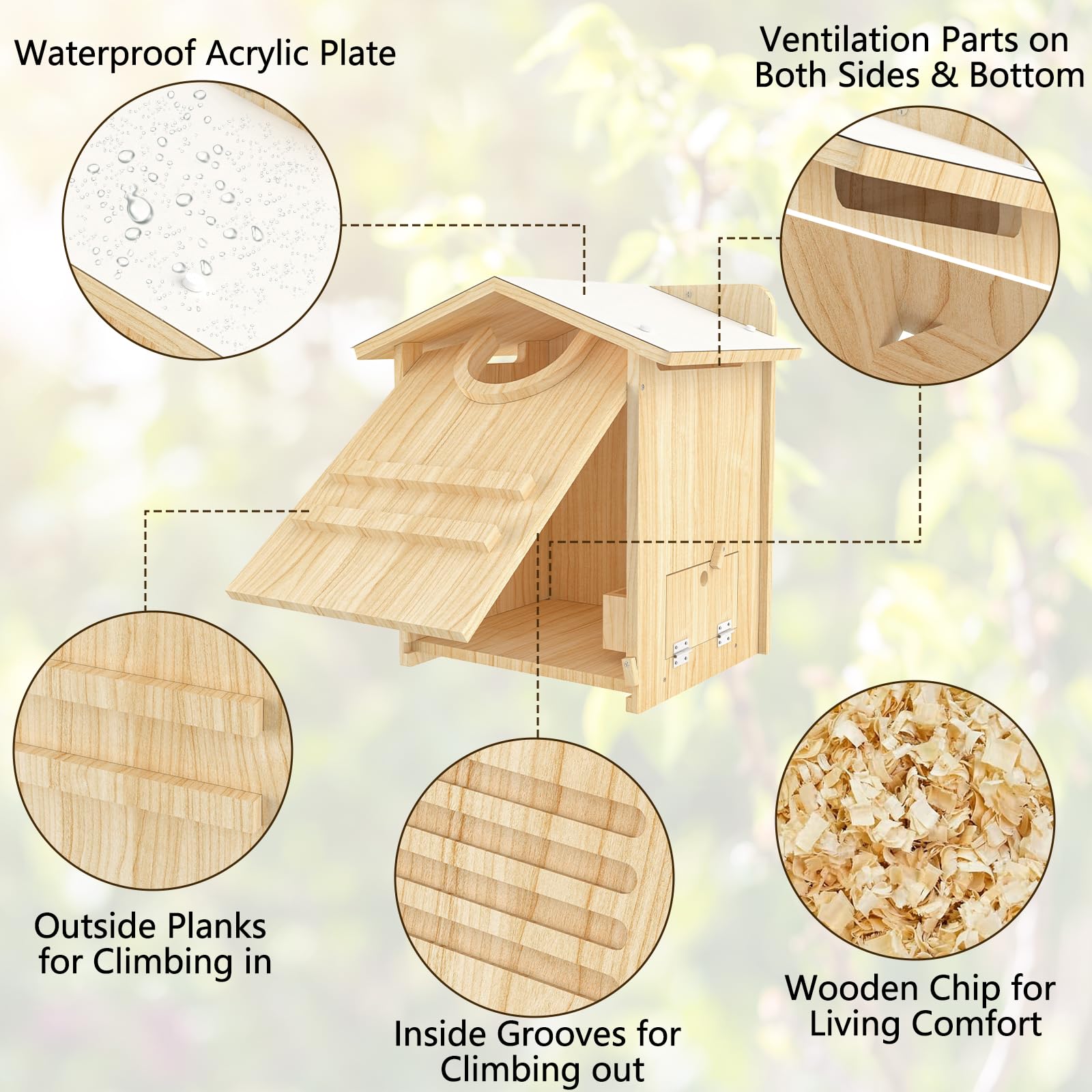 Safe feeding: The barn owl box come with a feeding trough,which designed with a shelter. The owls can use the shelter to observe the predators while feeding and block the attacks which not only meets the daily feeding needs, but also adds safety barriers to the feeding process. The owl houses for outdoors are well ventilated with multiple ventilation holes to ensure that the owl box is ventilated and moisture-proof.
