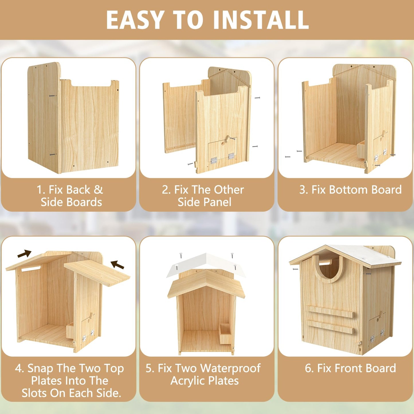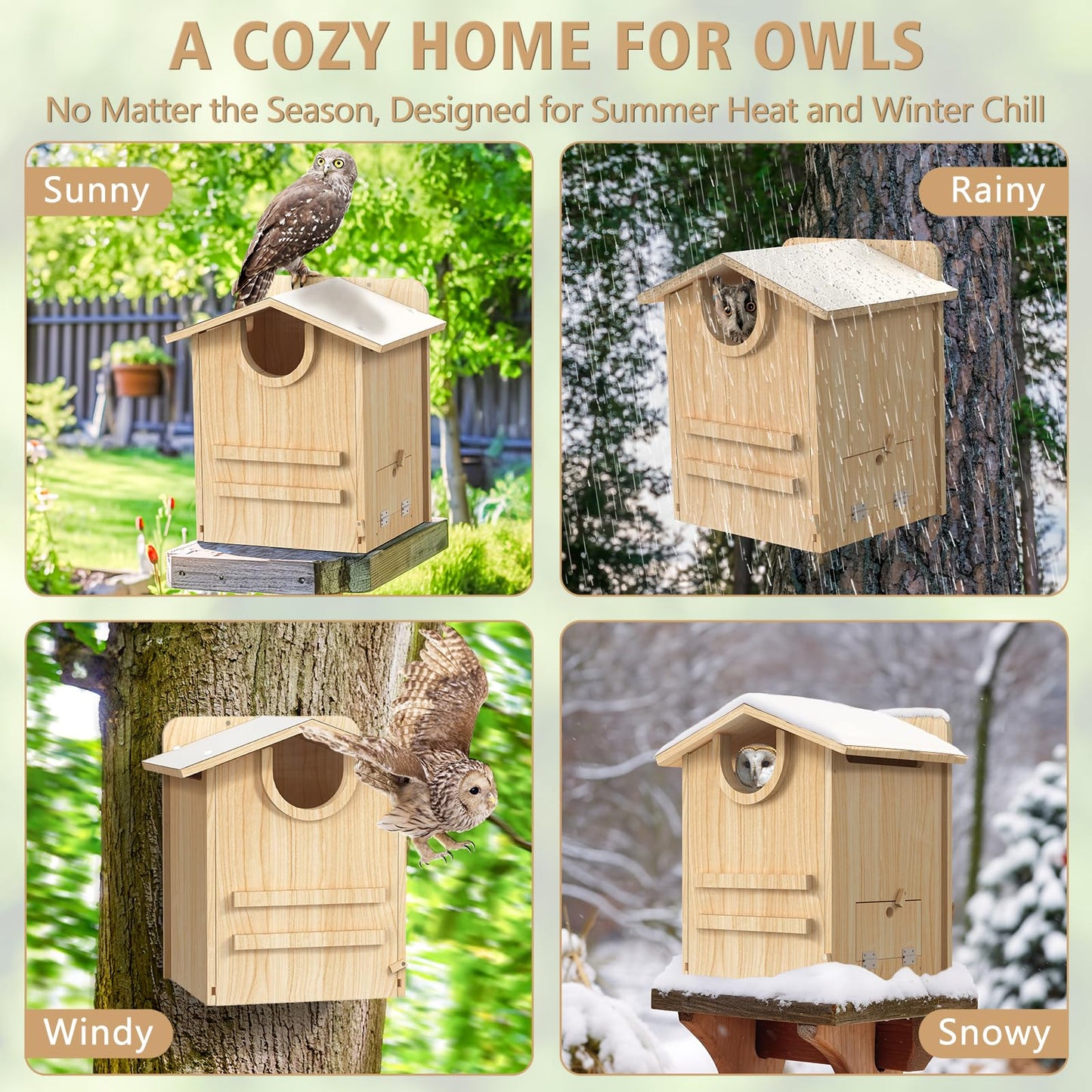 Easy to assemble:We provide video guide and installation instructions.The package of the screech owl nesting box comes with all mounting hardware. All you need is ten minutes of assembly to provide your owl with a cozy perch! Even beginners can easily complete the owl house assembly according to the instruction guide.
