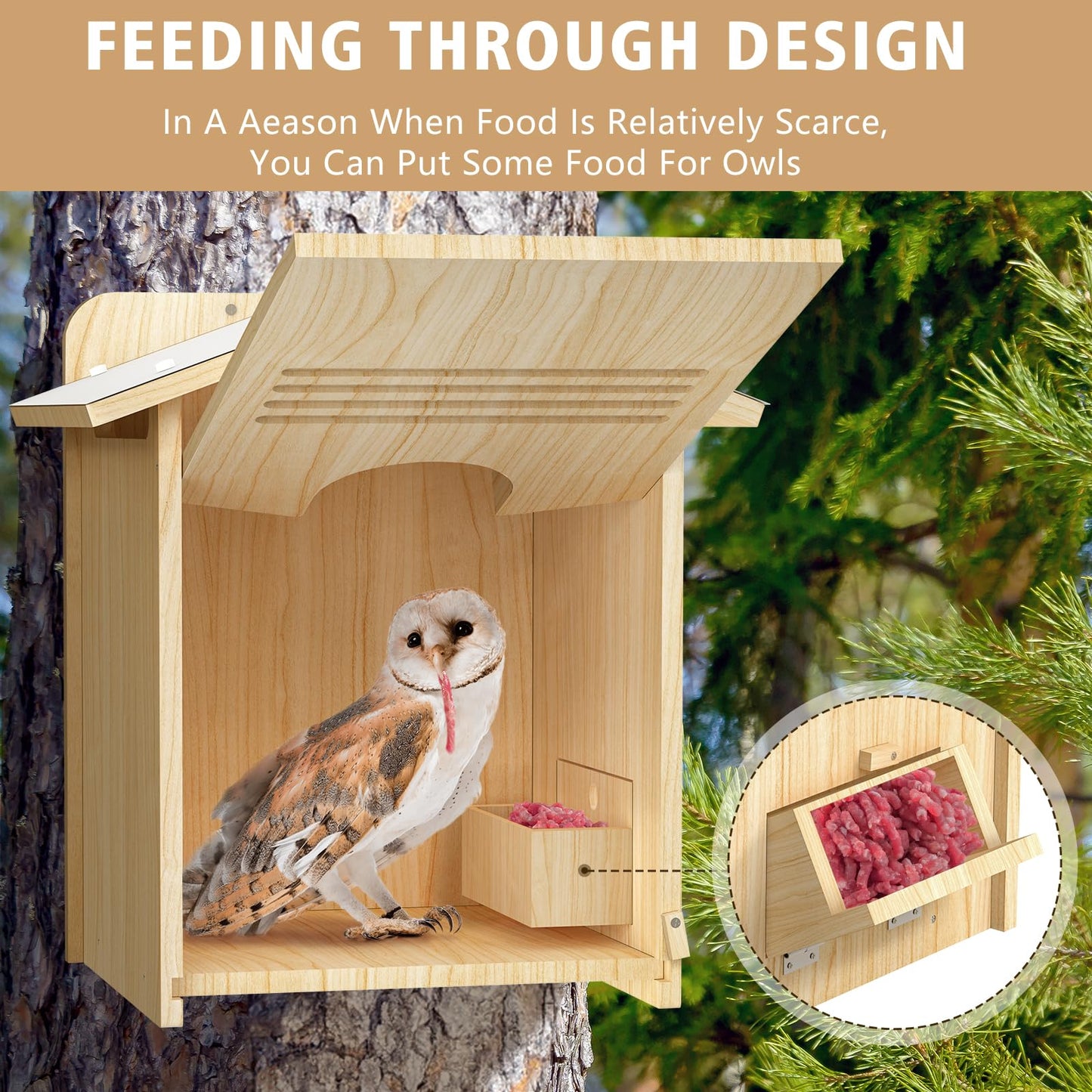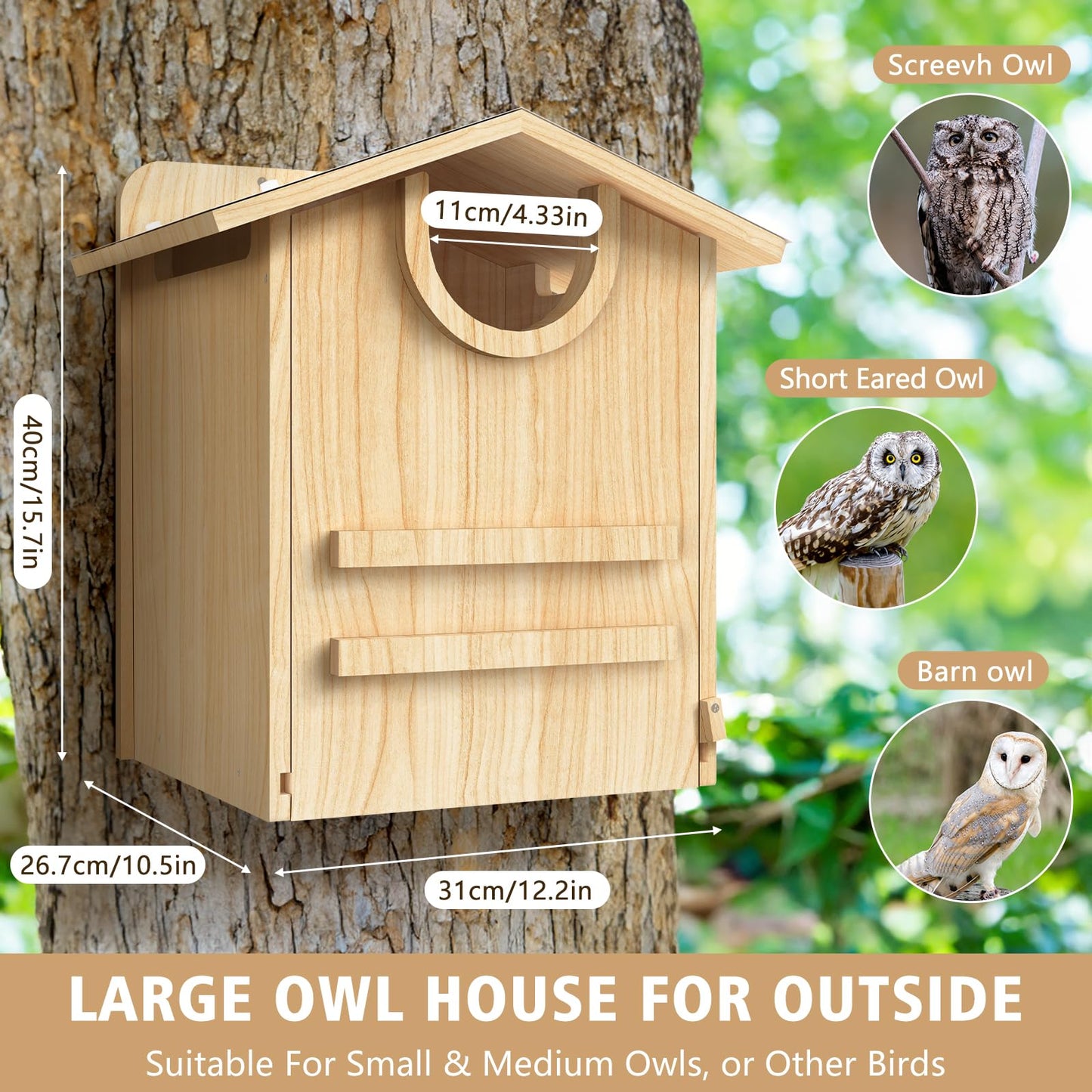 Owl House, Chuiendi Owl Nesting Box for Outside 15.7×10.5×12.2 Inches, Wood Screech Nest Box with Wood Chips and Feeding Trough, Barred and Screech Bird Nesting Box for Wildlife Barn Great Horned