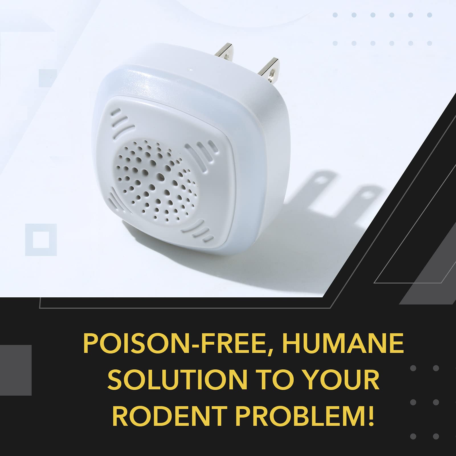 Plug & Go: OWLTRA Ultrasonic Rodent Repellers 4 pack is a poison-free solution to your pest problem. Each plug-in repeller emits a high-frequency sound that provides enough coverage to any medium-sized room in your home. While 100% silent to humans and non-rodent pets, the ultrasonic sound will put rodents in distress, causing them to leave your home within two weeks of use. Simply plug the Ultrasonic Rodent Repellers into a wall outlet, and you're set.