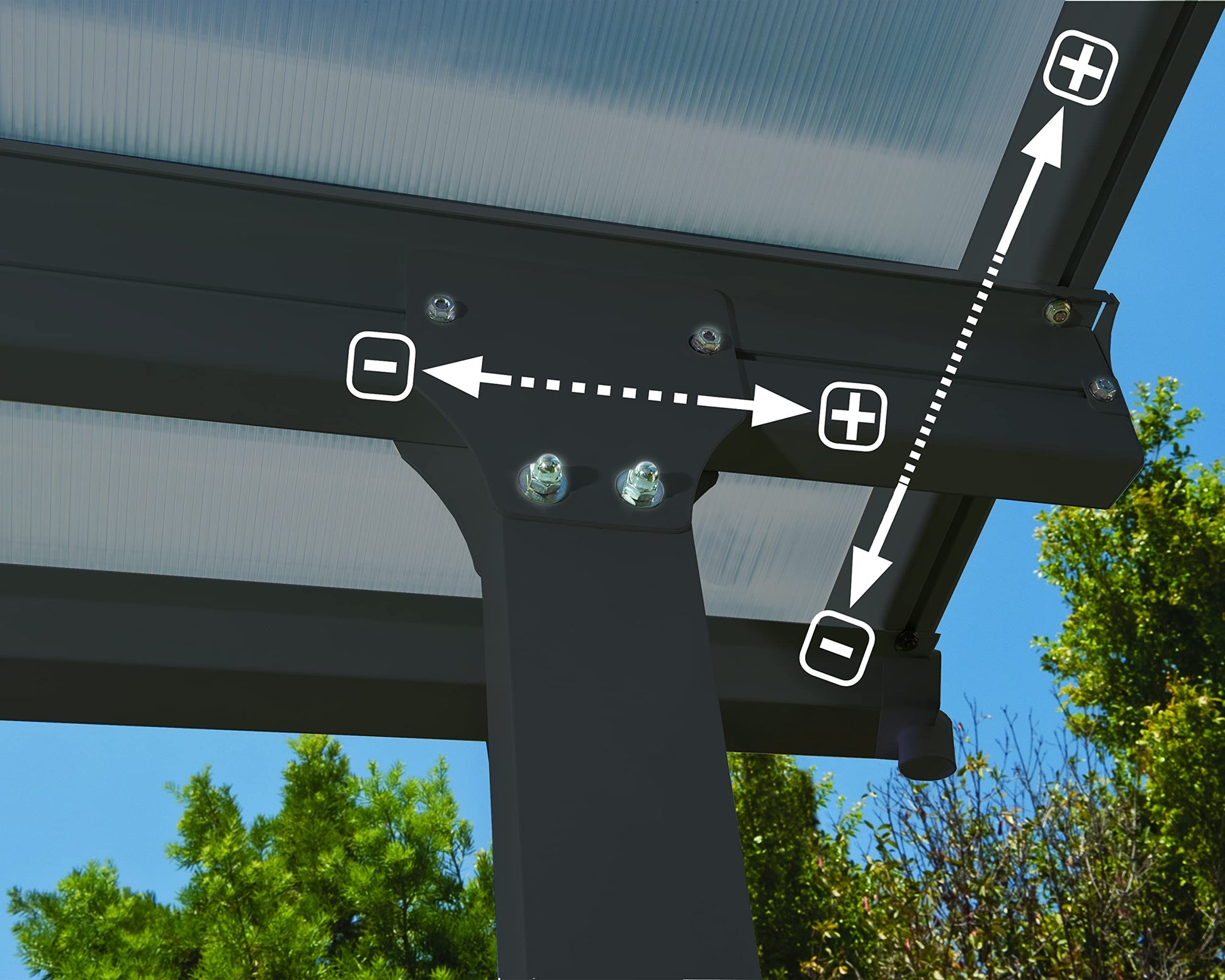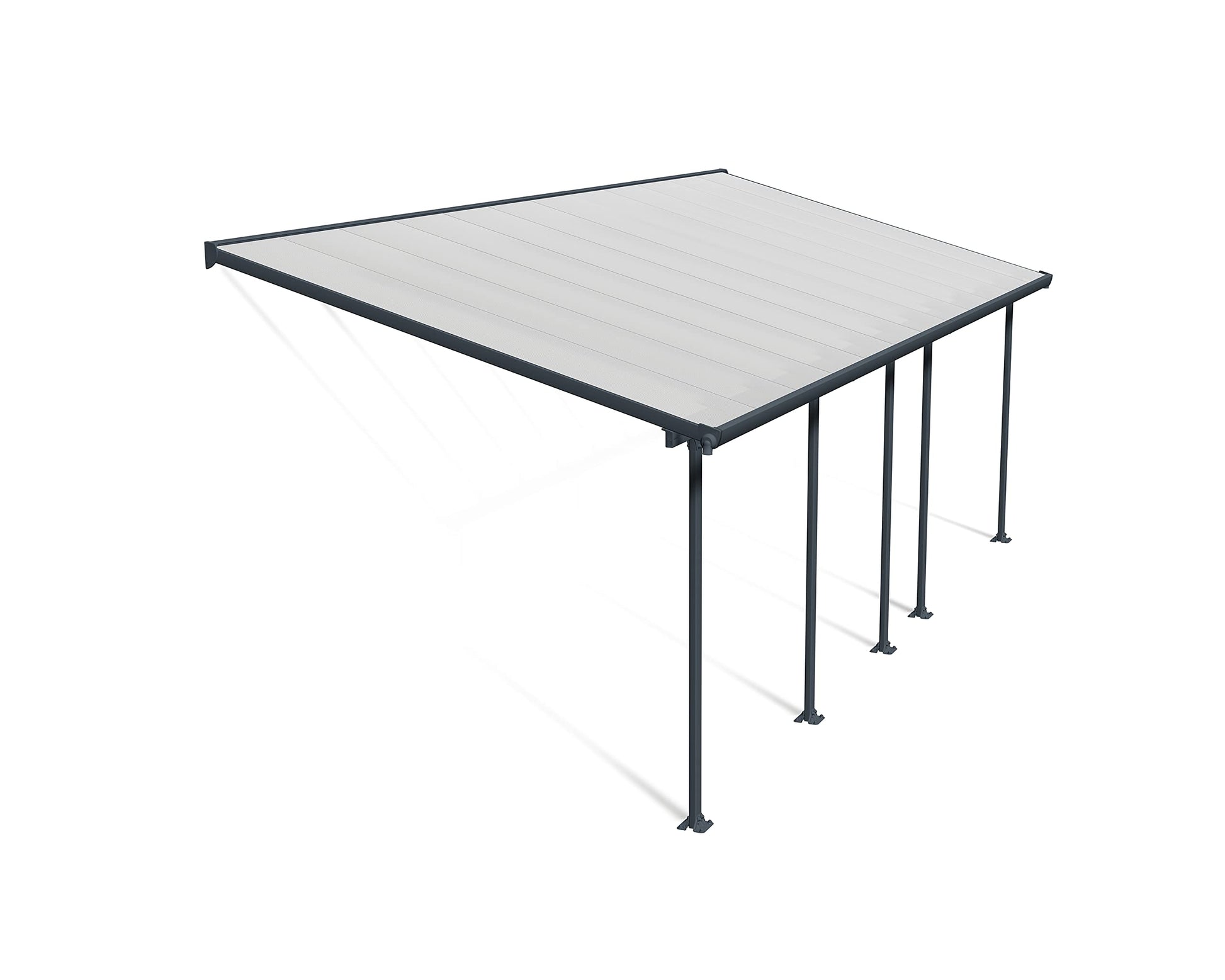 Protect yourself and your patio from the elements with the Feria patio cover. Clear, UV protected, polycarbonate roof panels protect you, your family and patio furniture from harsh UV rays, while still allowing sun to shine through. Gray powder coated aluminum frame is neutral enough to match any home color, and provides protection from rust and discoloration.