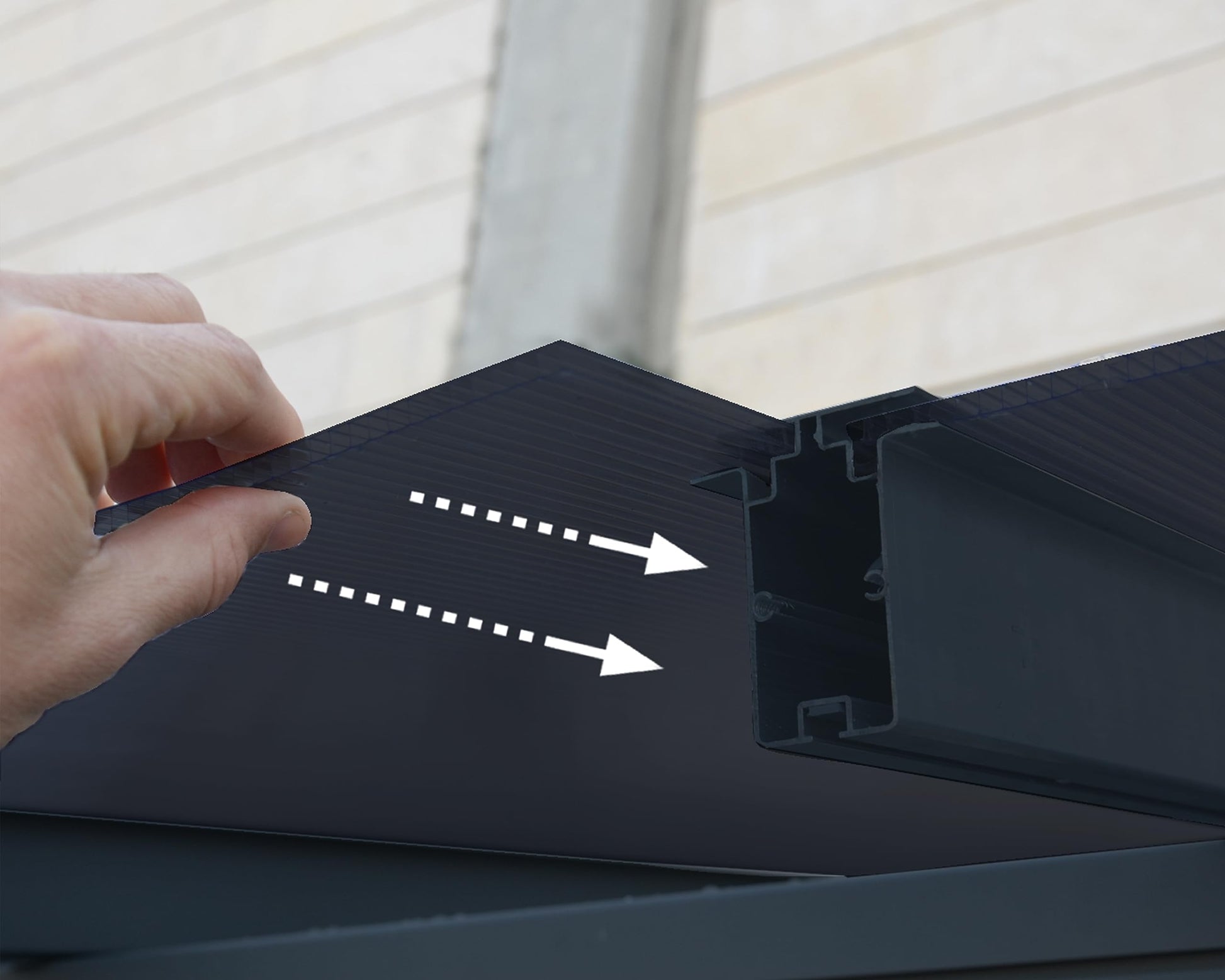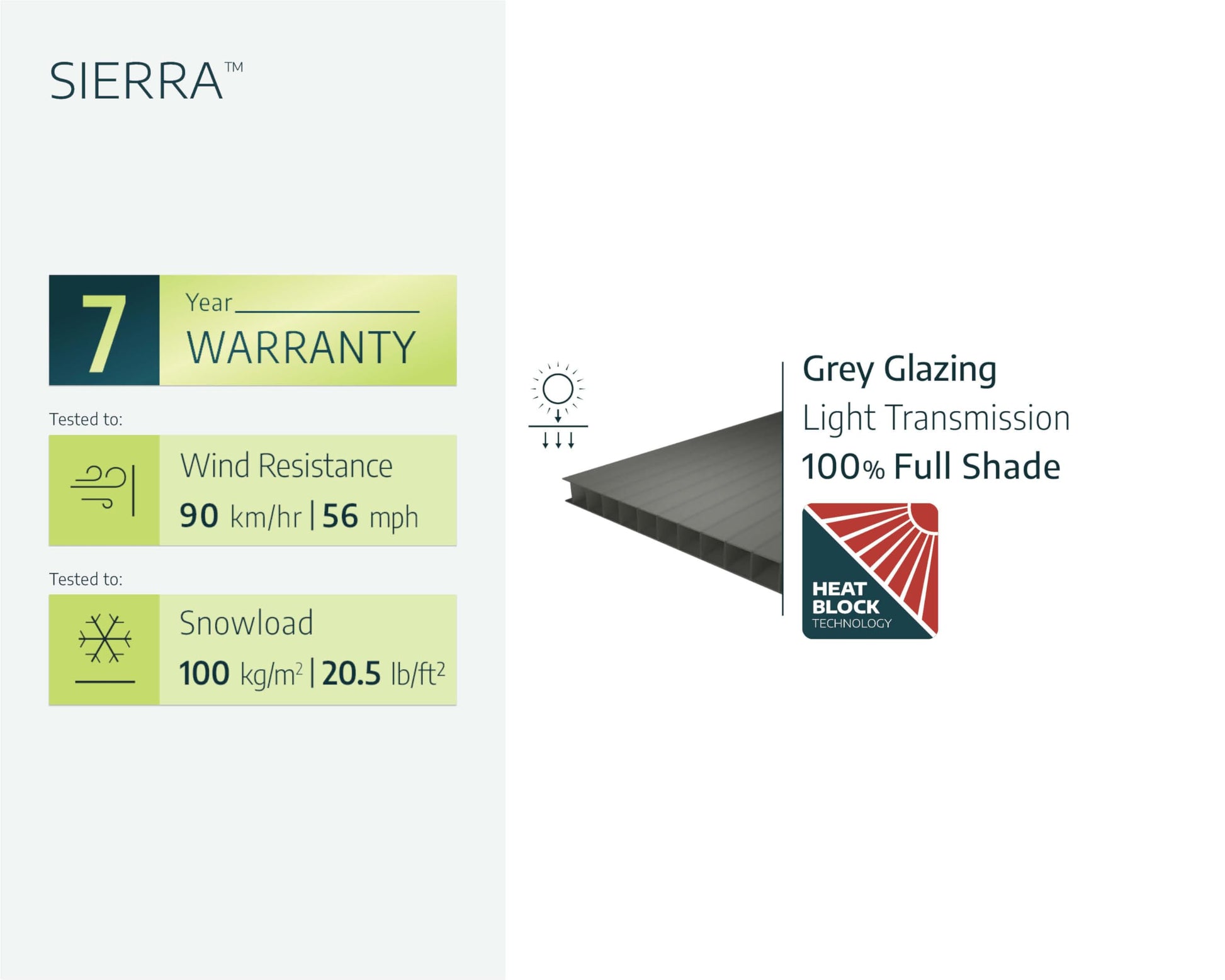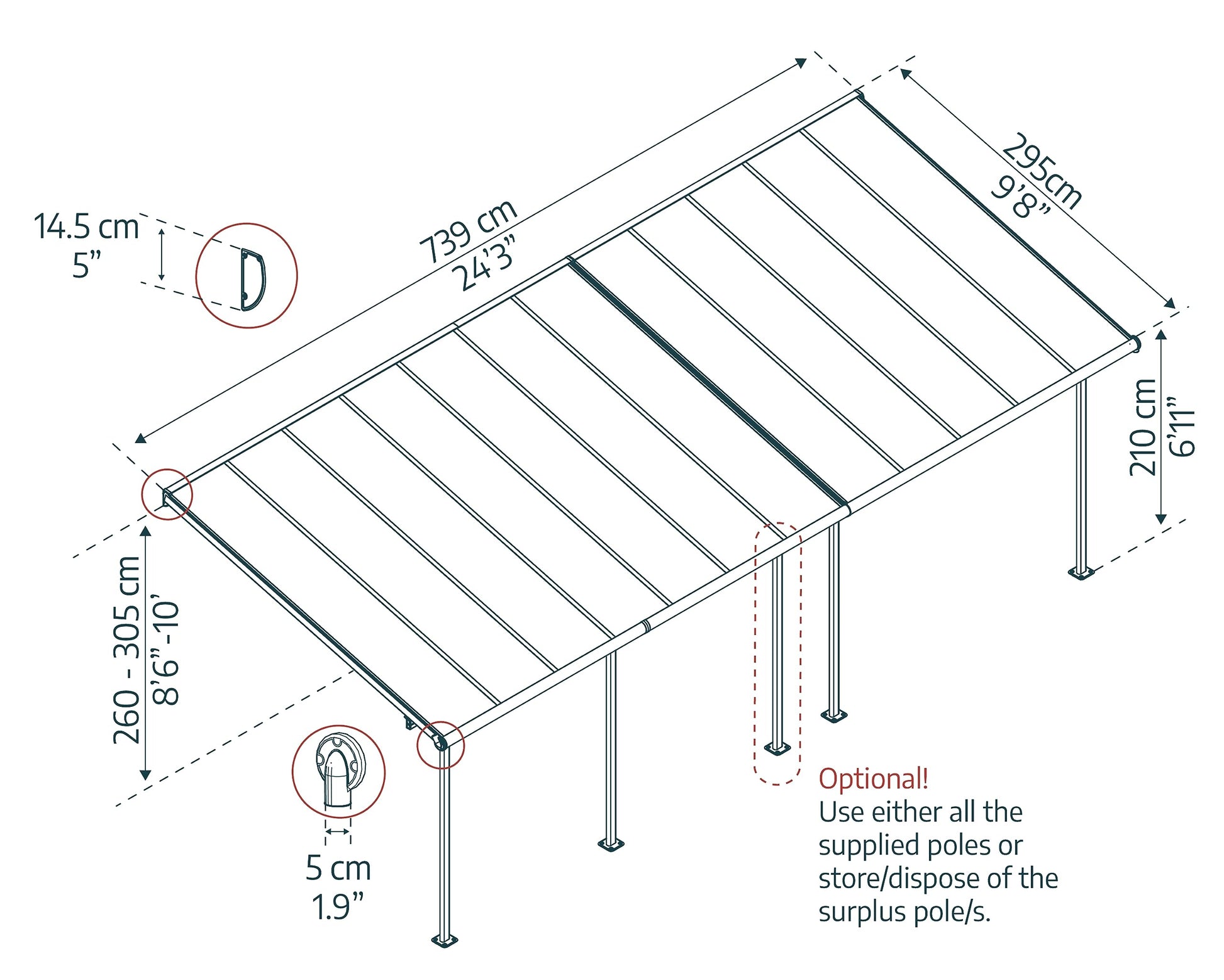 Details: Enhance your outdoor experience with the Sierra Patio Cover, an aesthetic, multi-purpose roofing solution. This stylishly crafted sturdy addition enables you to luxuriate in your outdoor space year-round. Enjoy family get-together's and cookouts without fearing the fickle weather will ruin your fun. The Sierra is an aesthetic, multi-purpose, maintenance free roofing solution allowing for various outdoor uses such as a balcony or patio cover, sun lounge, door awning etc. The Sierra is a high performance structure, with flexible positioning, enabling you to set your required height at the wall connection, the distance from the house and between the oval poles at the front. It was designed to be simply assembled by 2 people, using the sliding panel system for safe and simple assembly; it requires no experience, no special skills and no special tools. The Sierra provides your family with an elegant, sturdy and rust-free outdoor living space for years to come.