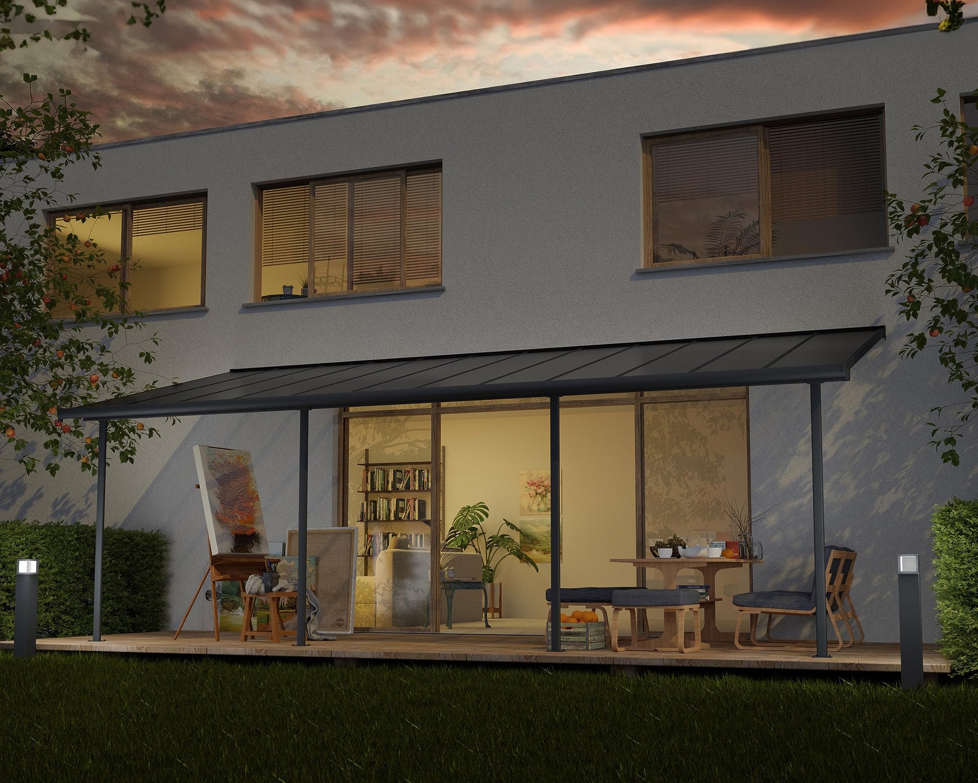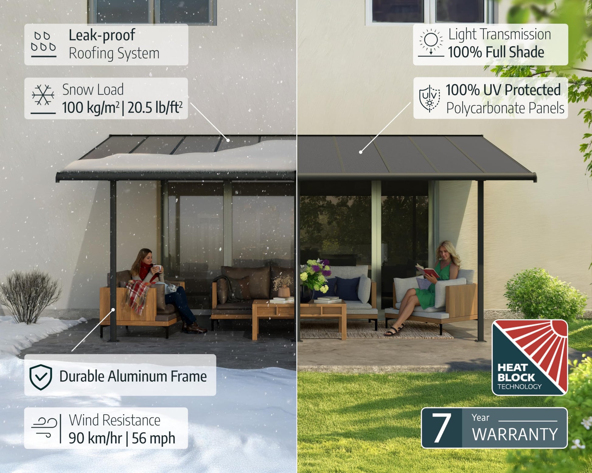 PREMIUM MATERIALS THAT ALLOW FOR SEAMLESS INTERGRATION WITH ANY HOME DESIGN AND OUTDOOR SPACE - Featuring elements of powder coated galvanized steel and aluminum, this modern patio cover enhances all outdoor spaces. The twin-wall panels maintain their integrity, provide complete UV blockage, and are 100% UV protected; they do not discolor, fracture or become brittle over time