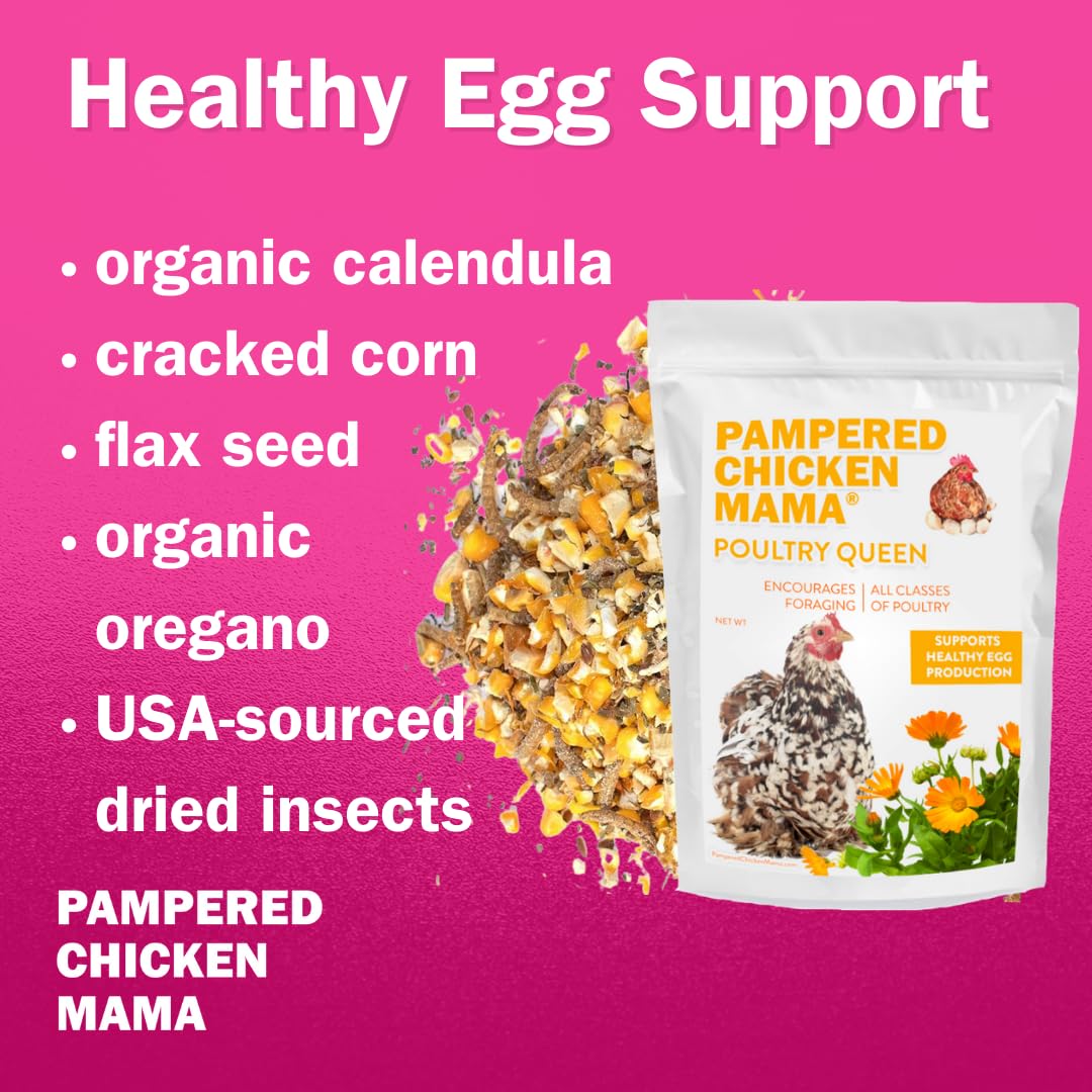 Yummy Egg Layer Feed Treat: Lots of protein & omega-6 fats for great feathers and eggs! Perfect for backyard chickens who love herbs! Pampered Chicken Mama’s Poultry Queen Treat with Mealworms, Non-Gmo Corn, Non-GMO Flax, and Herbs is perfect for backyard chickens who love herbs!