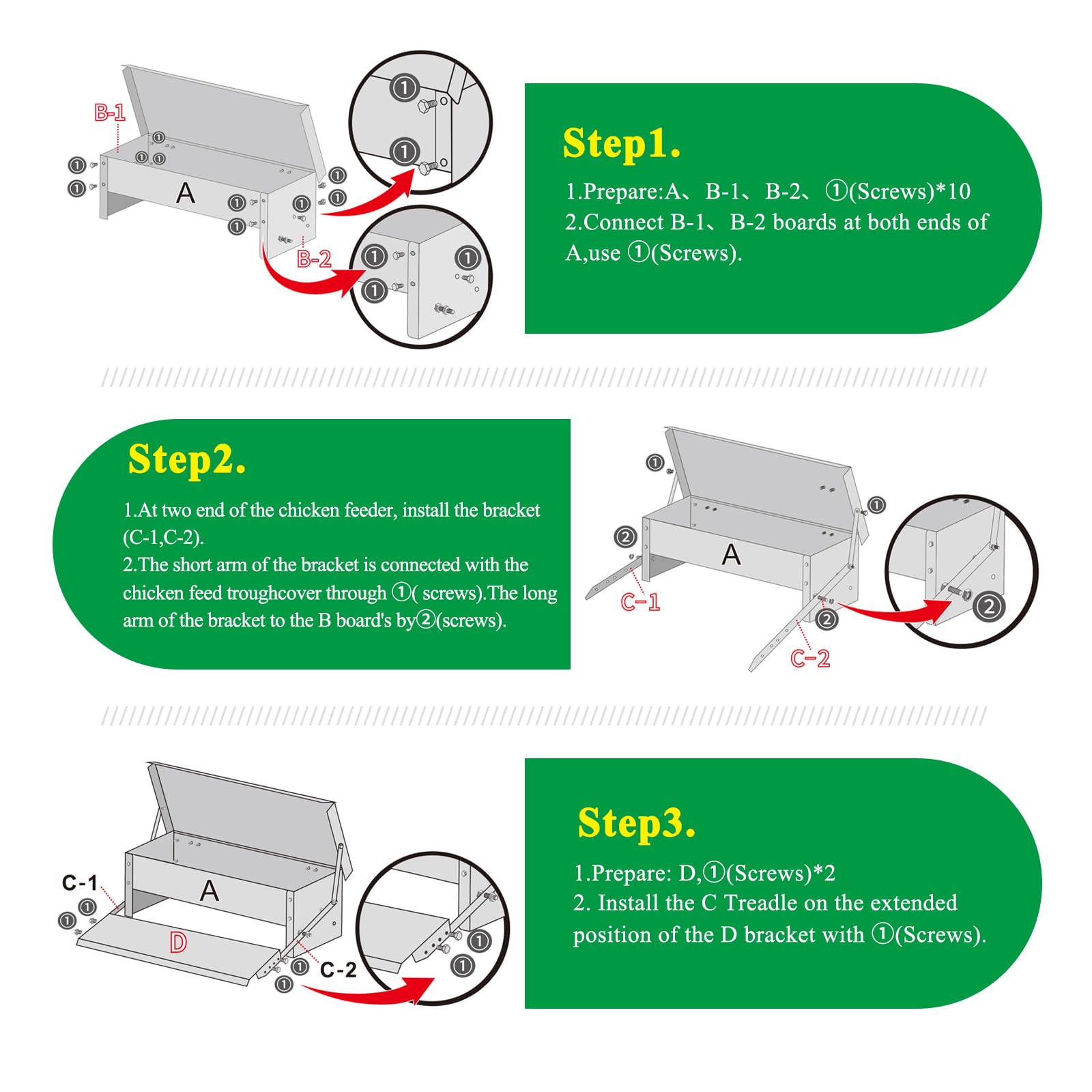 Warm Reminder: The non-slip diamond pattern helps protect the poultry from standing steadily. Do not tighten the screws and bolts on the linkage or it will be difficult to open or close automatically. In addition, chickens must weigh more than 1.1 pounds to start and operate the feeder by themselves.