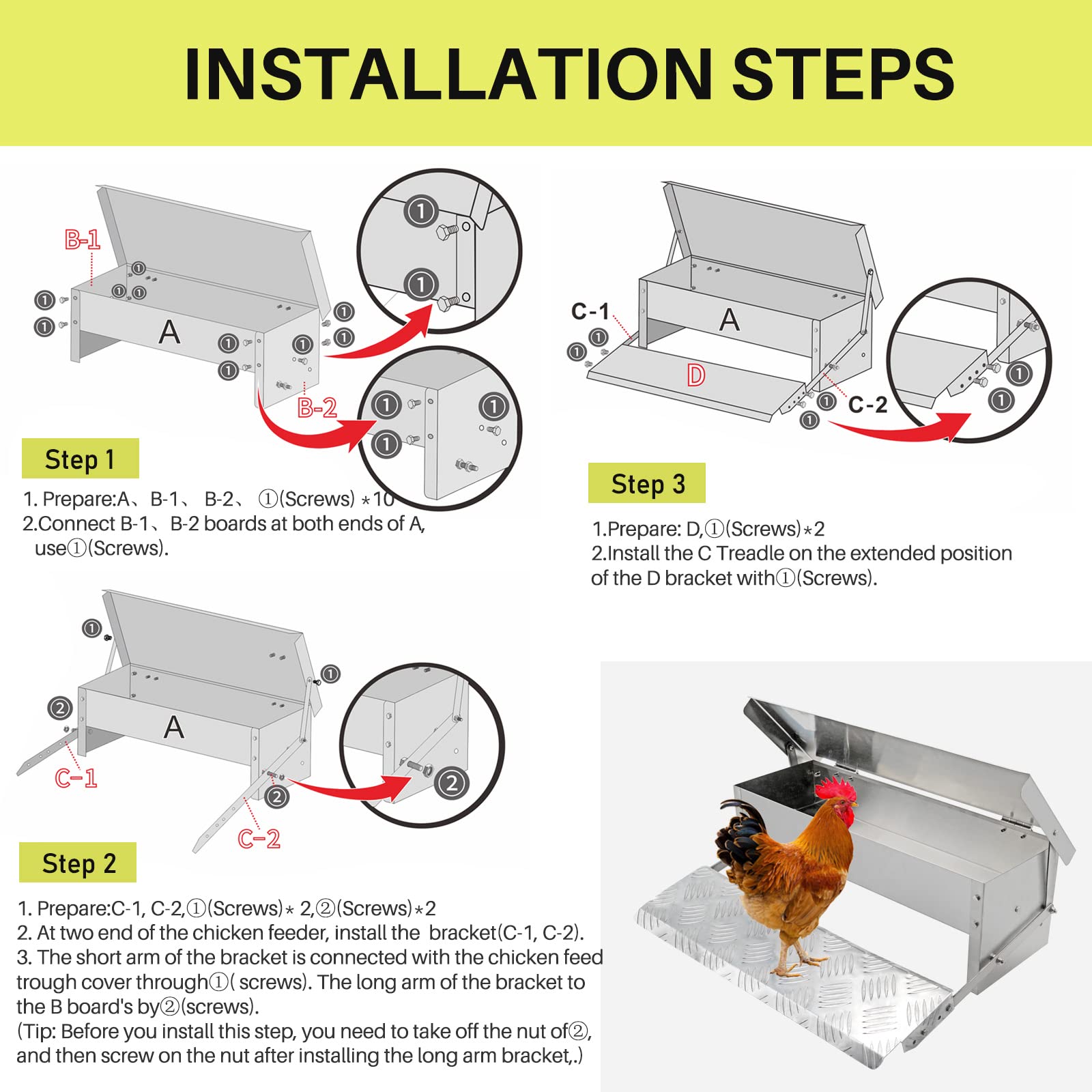 【TREADLE CHICKEN FEEDER MATERIAL】Solid stainless steel construction, durable, and long lasting. Which can be used under the harshest outdoor conditions, keeping the feed clean and fresh. Our package contains a user manual, please read it carefully and install it.