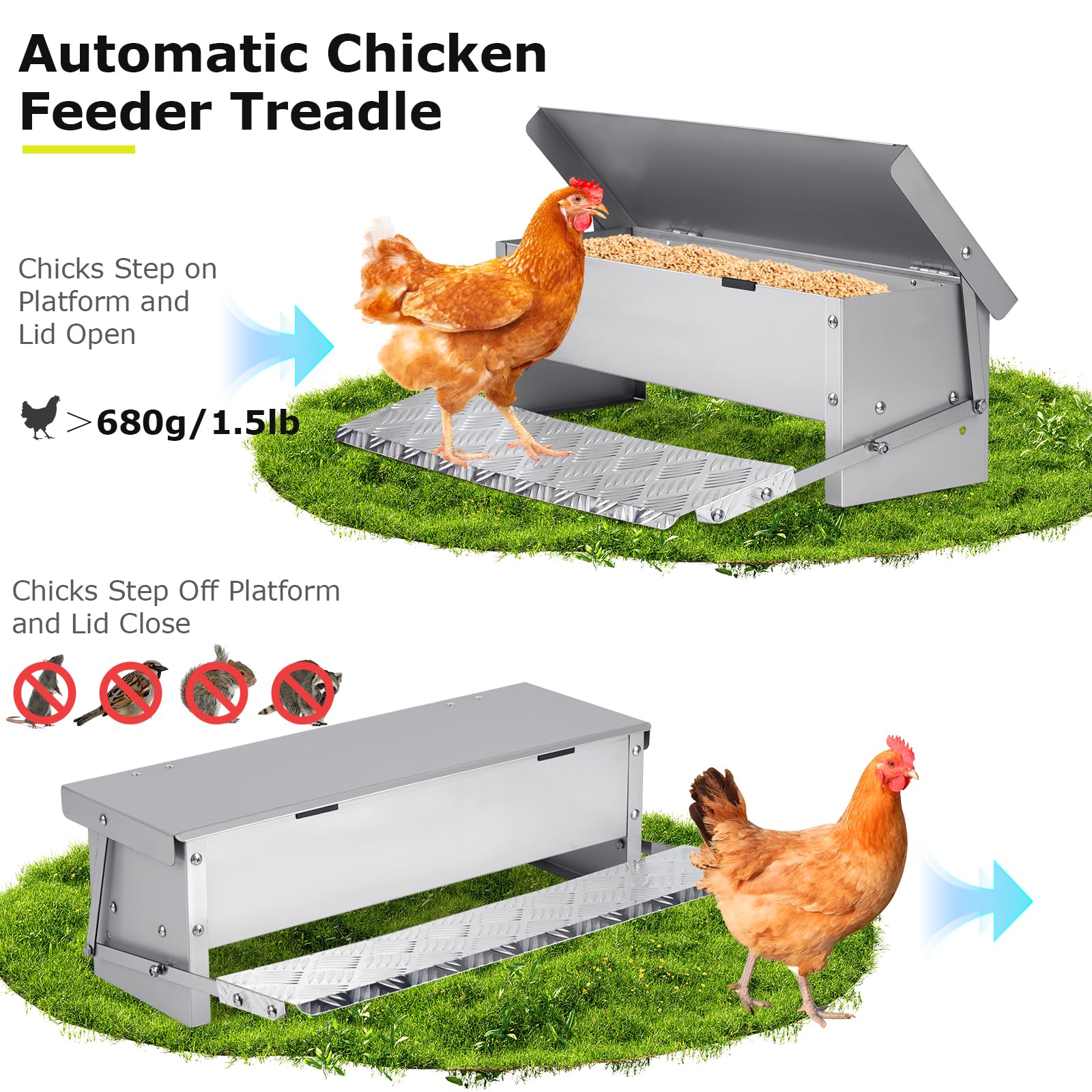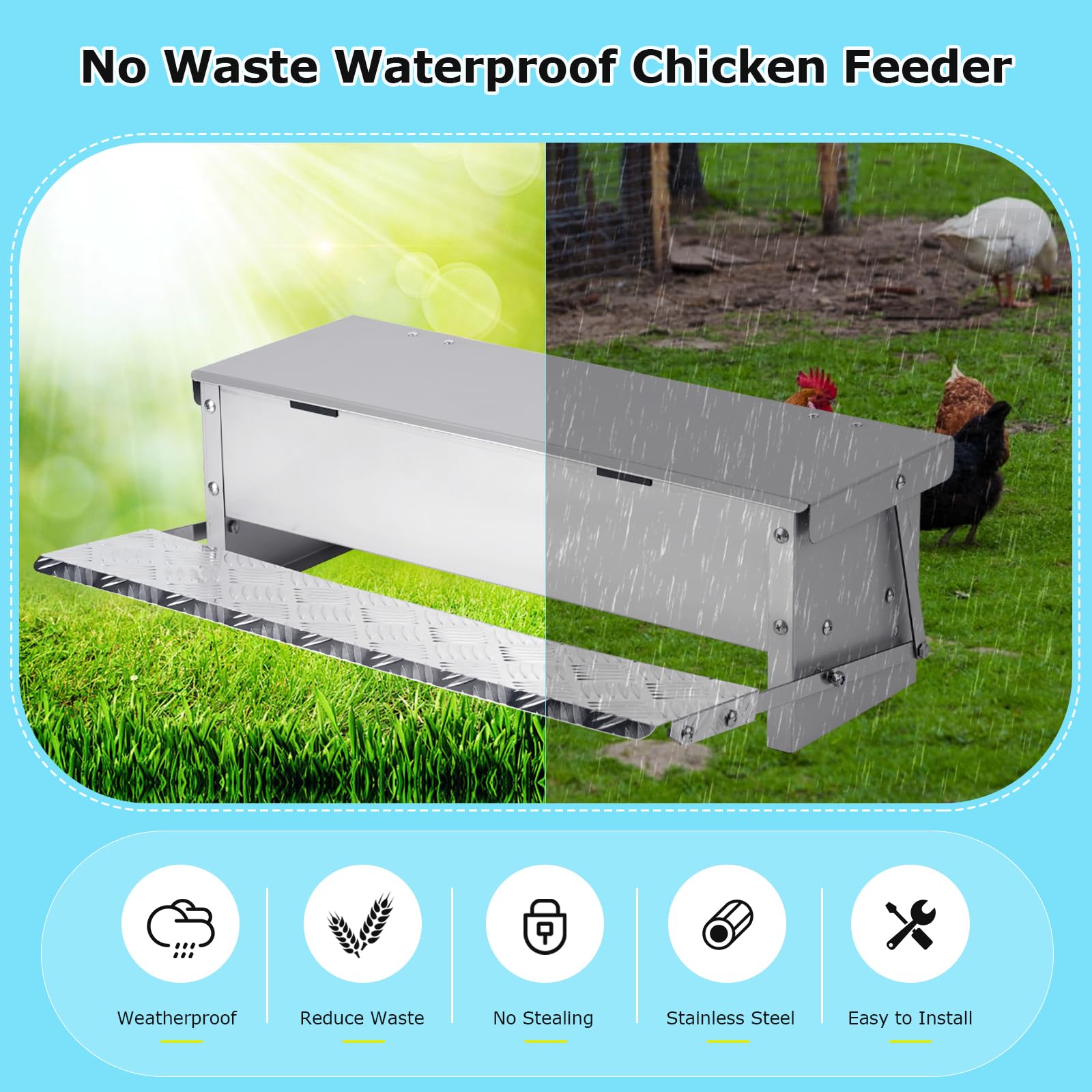 【SAVE MONEY AND TIME】With the protection of our outdoor automatic chicken feeder, your feeding cost will be reduced with the reduction of feed waste rate. And you don't have to rush home every day to feed the chickens anymore. Just fill-up the treadle chicken feeder and go out for a week's holiday!