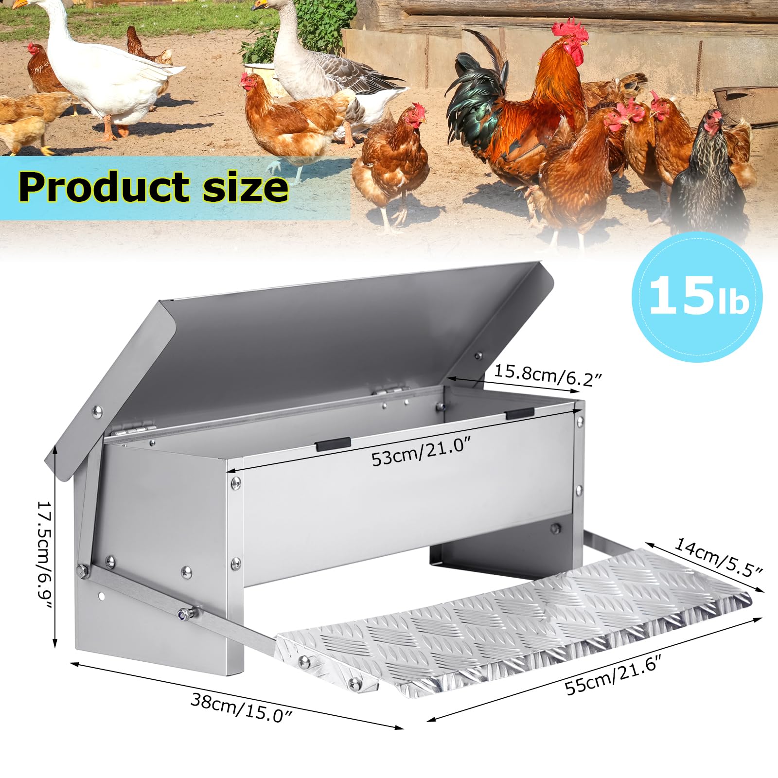 【LARGE CAPACITY DUCK FEEDER】Larger capacity, auto chicken feeder can hold up to 15lb of feed, our poultry feeder can feed 4-6 adult chickens at the same time, and the capacity of 11 lbs, can feed 6-10 chickens for about a week
