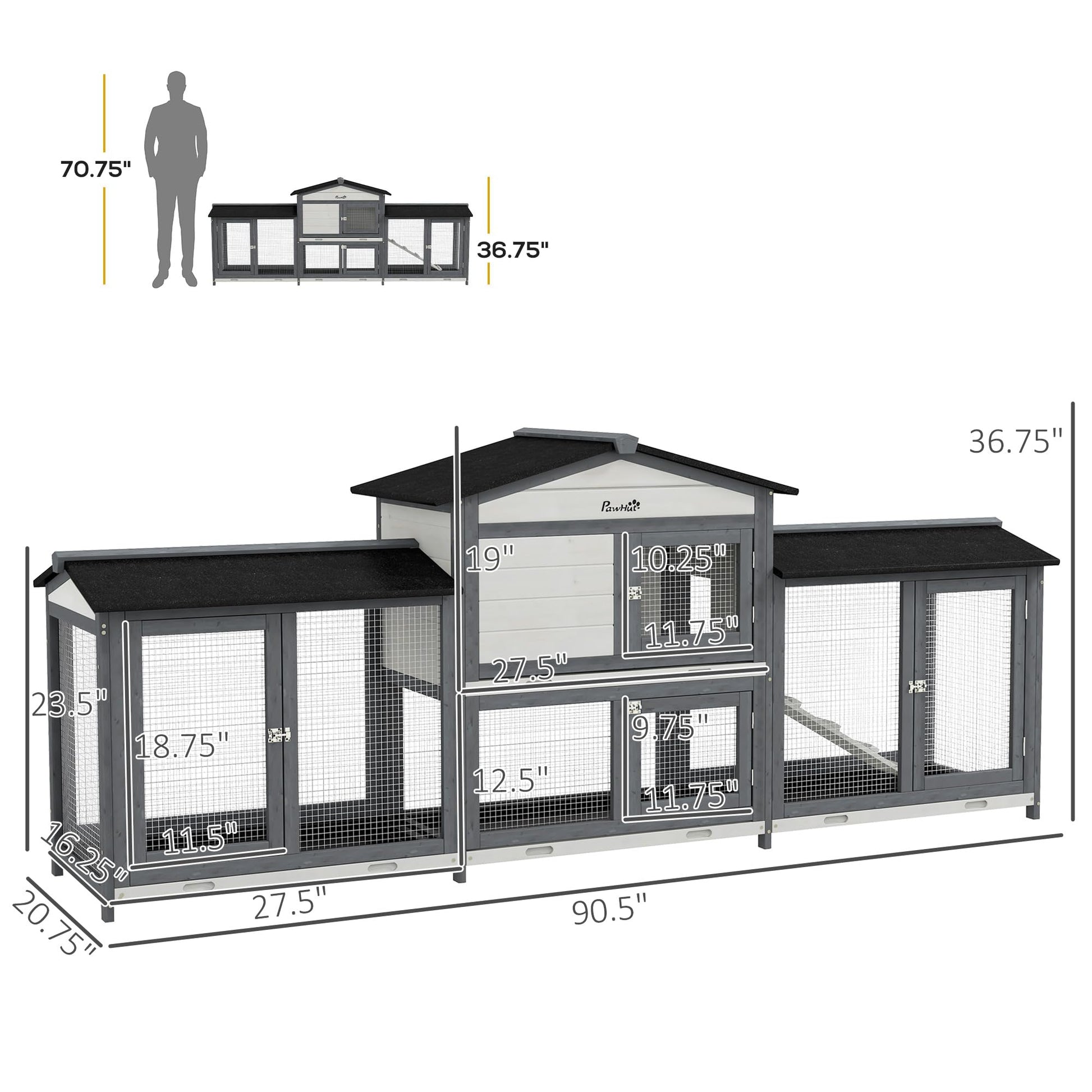 PawHut 90.5" Wooden Rabbit Hutch Bunny Cage Pet Playpen House Enclosure with Double Side Run Boxes, No Leak Tray, Ramp, for Guinea Pig and Small Animals, Light Gray