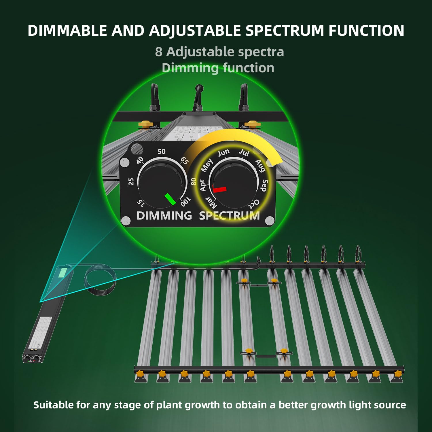 8 SPECTRUMS CAN BE ADJUSTED Mimics outdoor sunlight from March to October ,spectrum 4500-3600K plants need more blue light during the growing season and you can adjust to March-June. Plants need more red light during flowering and harvesting, you can adjust it to July-October to produce higher quality crops and greater yields