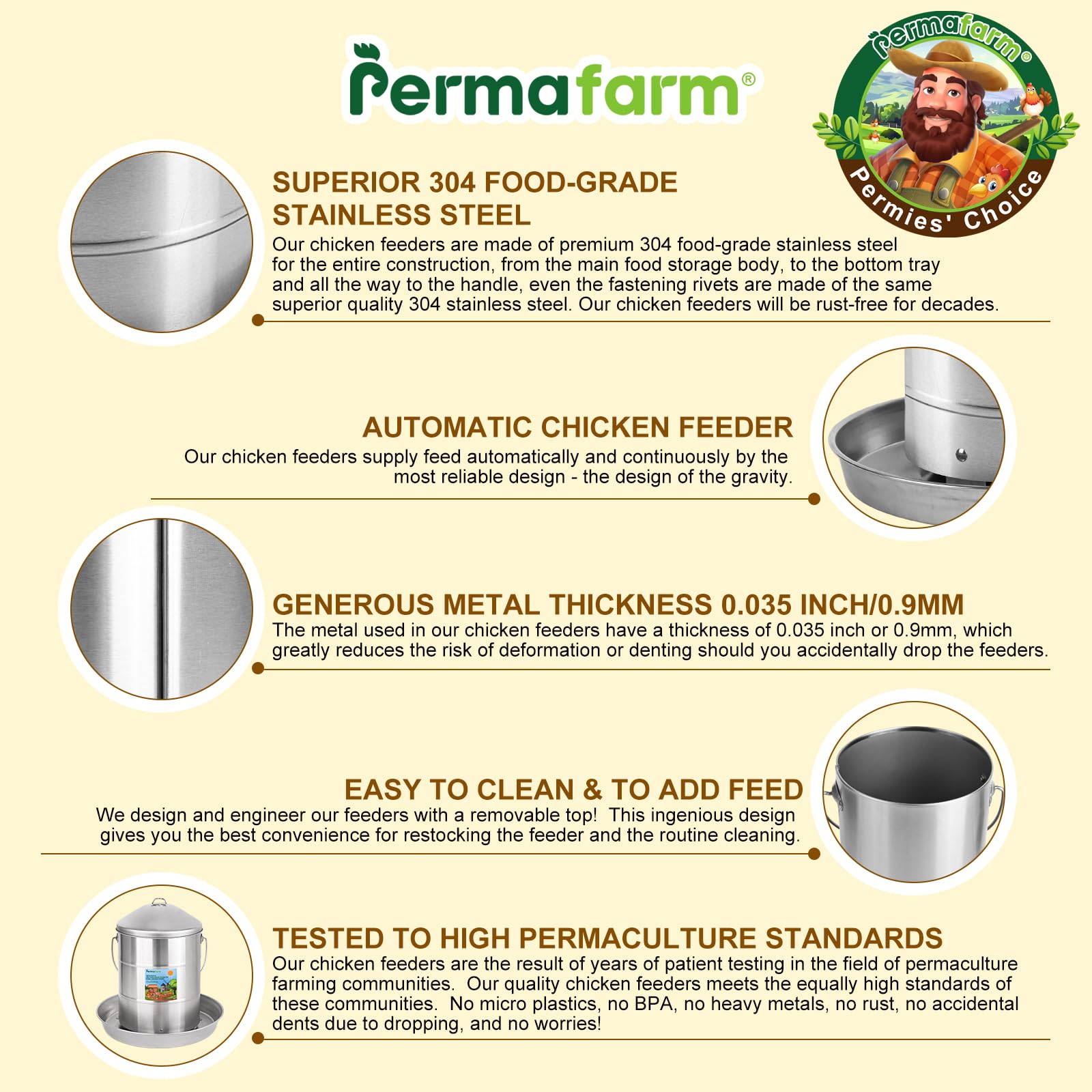 โค๏ธใ๐๐ก๐ ๐๐๐ซ๐ฆ๐๐๐๐ซ๐ฆ ๐๐ซ๐จ๐ฆ๐ข๐ฌ๐ใAt Permafarm, we are proud members of the permaculture community, committed to sustainability, ethical practices, and the well-being of both animals and the environment. We understand the importance of reliable, high-quality equipment for your flock. That is why our feeder is designed to deliver lifelong durability, zero leaks, and zero worries. Whether youโre a seasoned farmer or a backyard chicken keeper, this feeder is the ultimate investment in your chickensโ health and your peace of mind. ๐๐ฉ๐ ๐ซ๐๐๐ ๐๐จ๐ฎ๐ซ ๐๐จ๐ฎ๐ฅ๐ญ๐ซ๐ฒ ๐๐๐ซ๐ ๐๐จ๐๐๐ฒ ๐ฐ๐ข๐ญ๐ก ๐๐๐ซ๐ฆ๐๐๐๐ซ๐ฆ โ ๐๐ก๐๐ซ๐ ๐๐ฎ๐๐ฅ๐ข๐ญ๐ฒ ๐๐๐๐ญ๐ฌ ๐๐ง๐ง๐จ๐ฏ๐๐ญ๐ข๐จ๐ง!