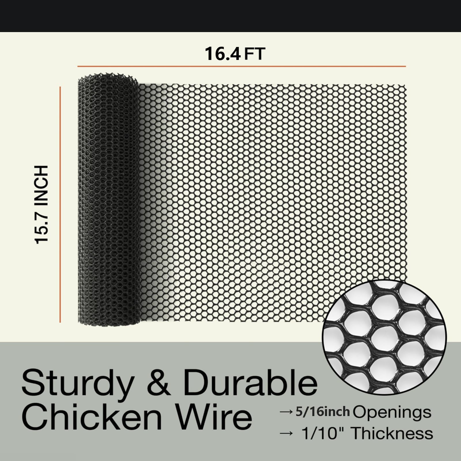Pet Proof Barrier Net, Black Plastic Chicken Wire Mesh Fencing 15.7IN x 16.4FT, Balcony Cat Safety Net & Garden Snake Barrier, Heavy Duty Protection for Chicken Coops, Rabbit Hutches, Dog Kennels