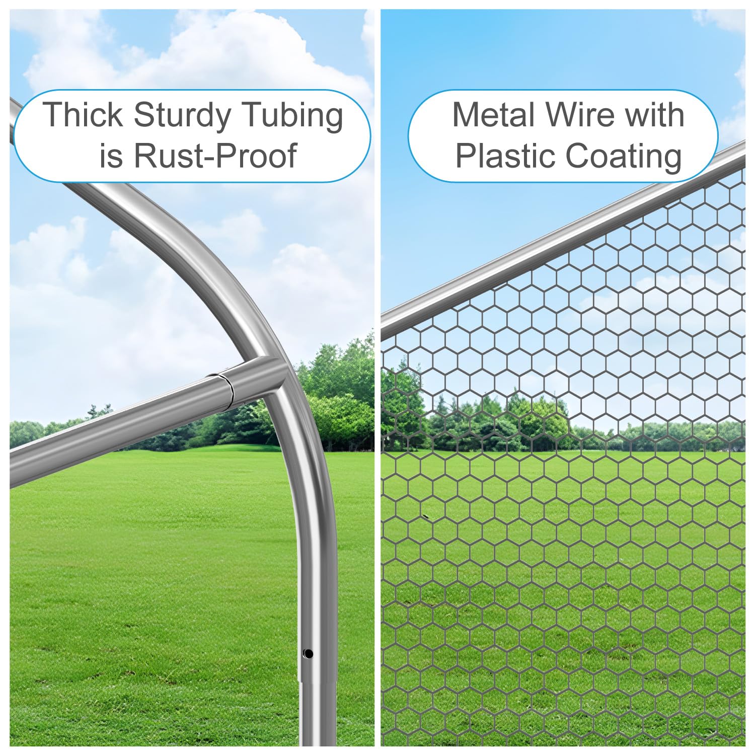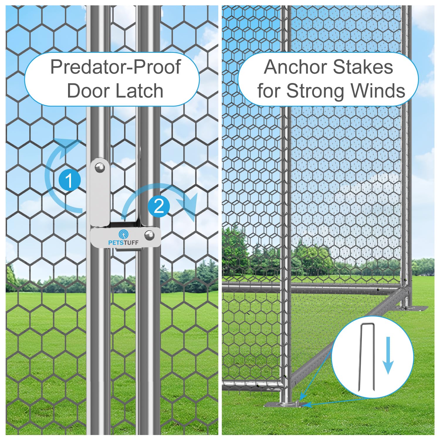 SECURE AND SAFE COOP: PetsTuff Chicken Run is designed to keep your animals secure and protected. The chicken run is equipped with durable, PVC coated hexagonal wire mesh that is weather-resistant. The strong material boasts tightly spaced gaps to safeguard your chickens from potential predators, ensuring security in the coop.