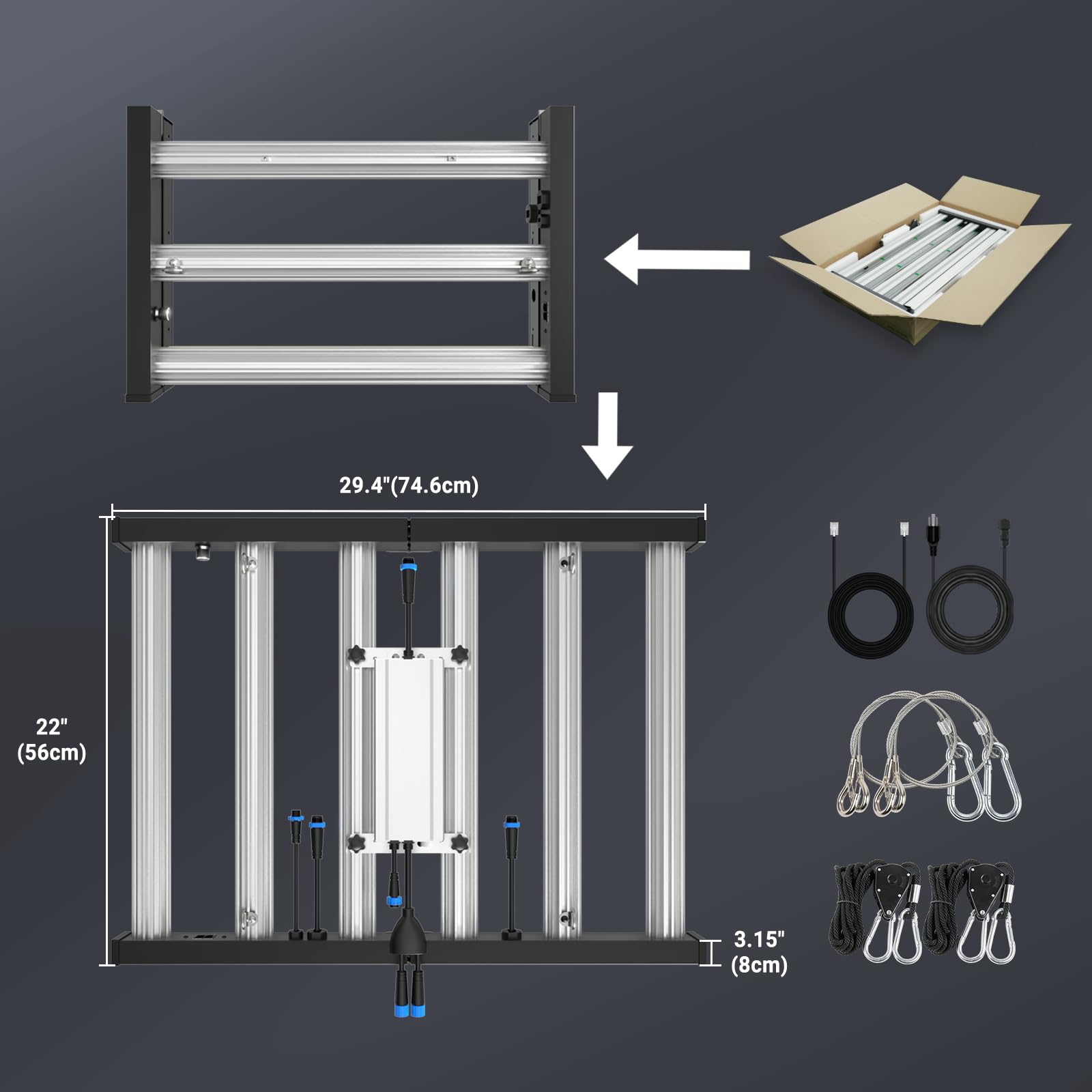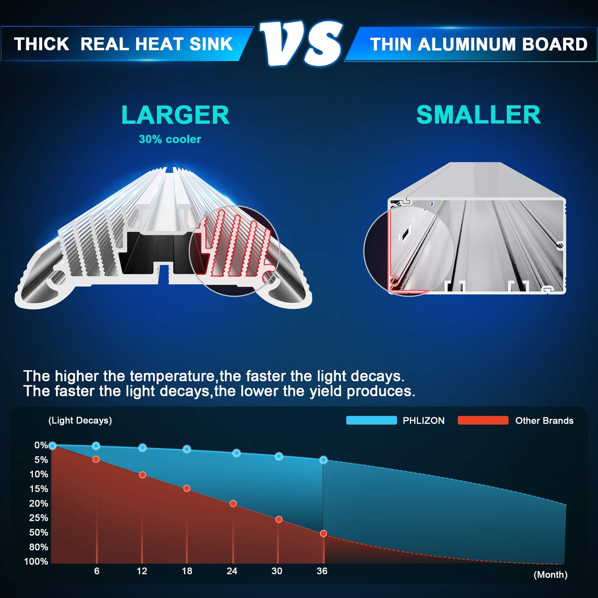 DIMMABLE AND FULL SPECTRUM- The intensity of light can be adjusted according to the needs of plants. The leds are all new technology SMD leds, It contains 1728pcs SMD led beads , including 1104pcs 3000K leds , 288pcs 6000K leds, 240pcs 660nm red leds,48pcs IR leds,48pcs UV leds.