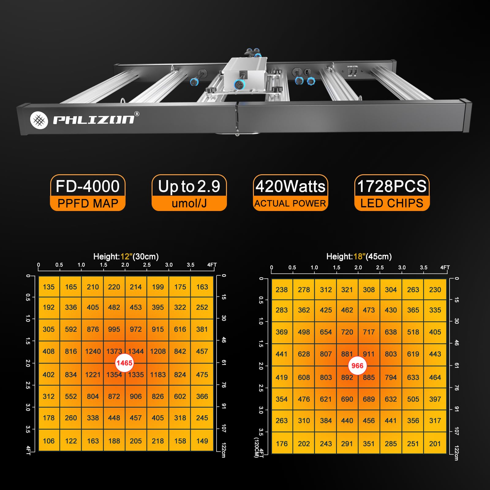 USE WITH SMD LEDS MAXIMIZE YIELD - The FD4000 grow light use with LM281B chips 1728pcs high efficient SMD leds,boast the market-leading efficiency to 2.9 µmol/J and 2.5g yield per wattage with 30% higher Average PPFD, the actual power is 420 watt, it can cover 6x6ft growing area in Veg stage and 5x5ft for flower stage.
