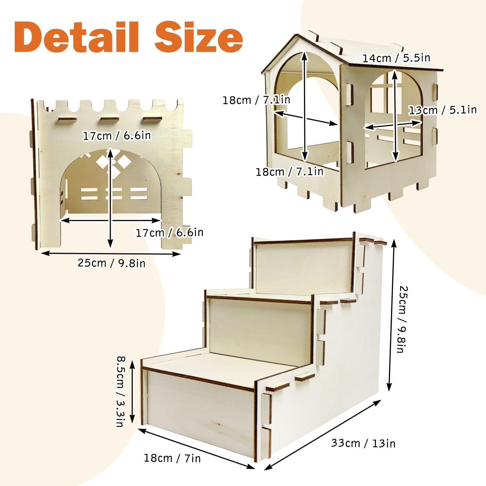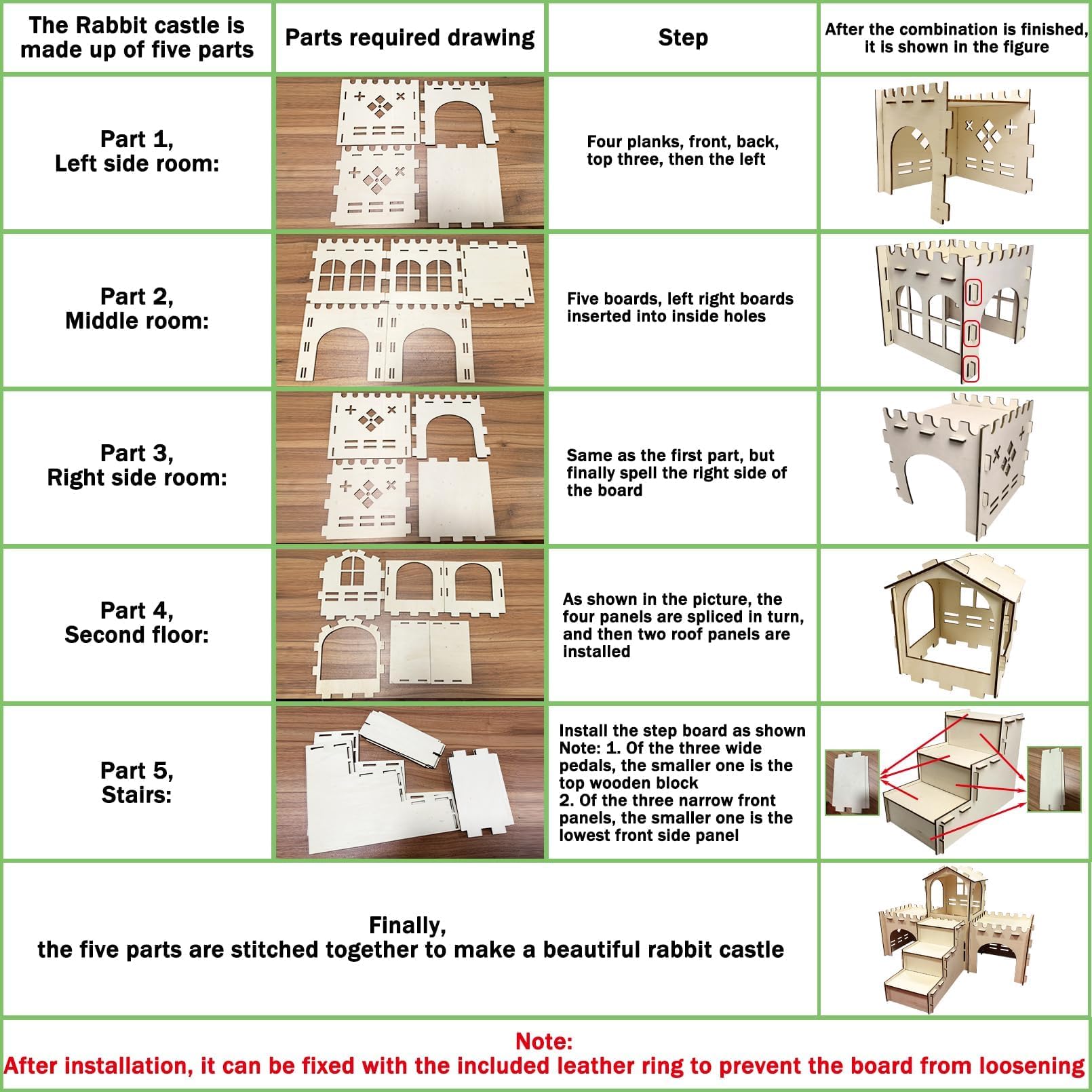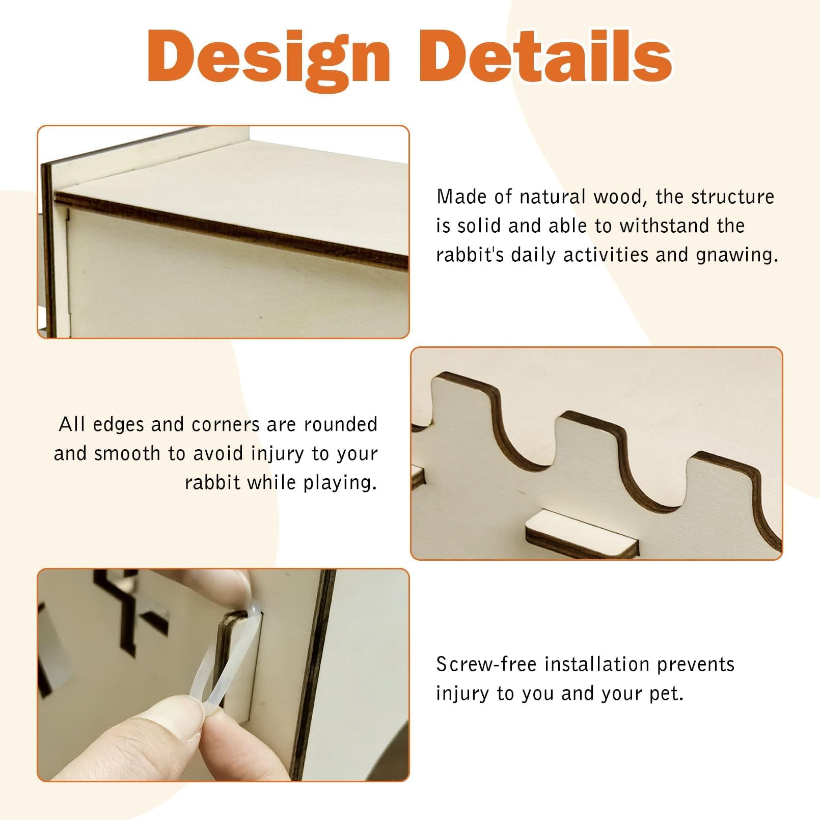 Nail-Free Installation: Our wooden rabbit castle is a nail-free design. It is crafted with delicate sanding and assembling for a stable structure. Ensure that there are no sharp edges in every corner of the wooden castle for the little animals to play