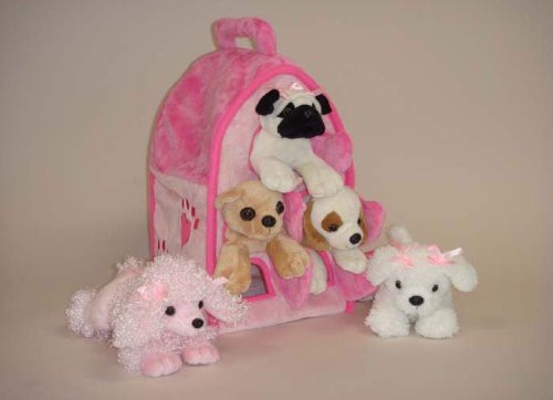 Plush Pink Dog House with Dogs - Five (5) Stuffed Animal Dogs in Pink Play Dog House Case