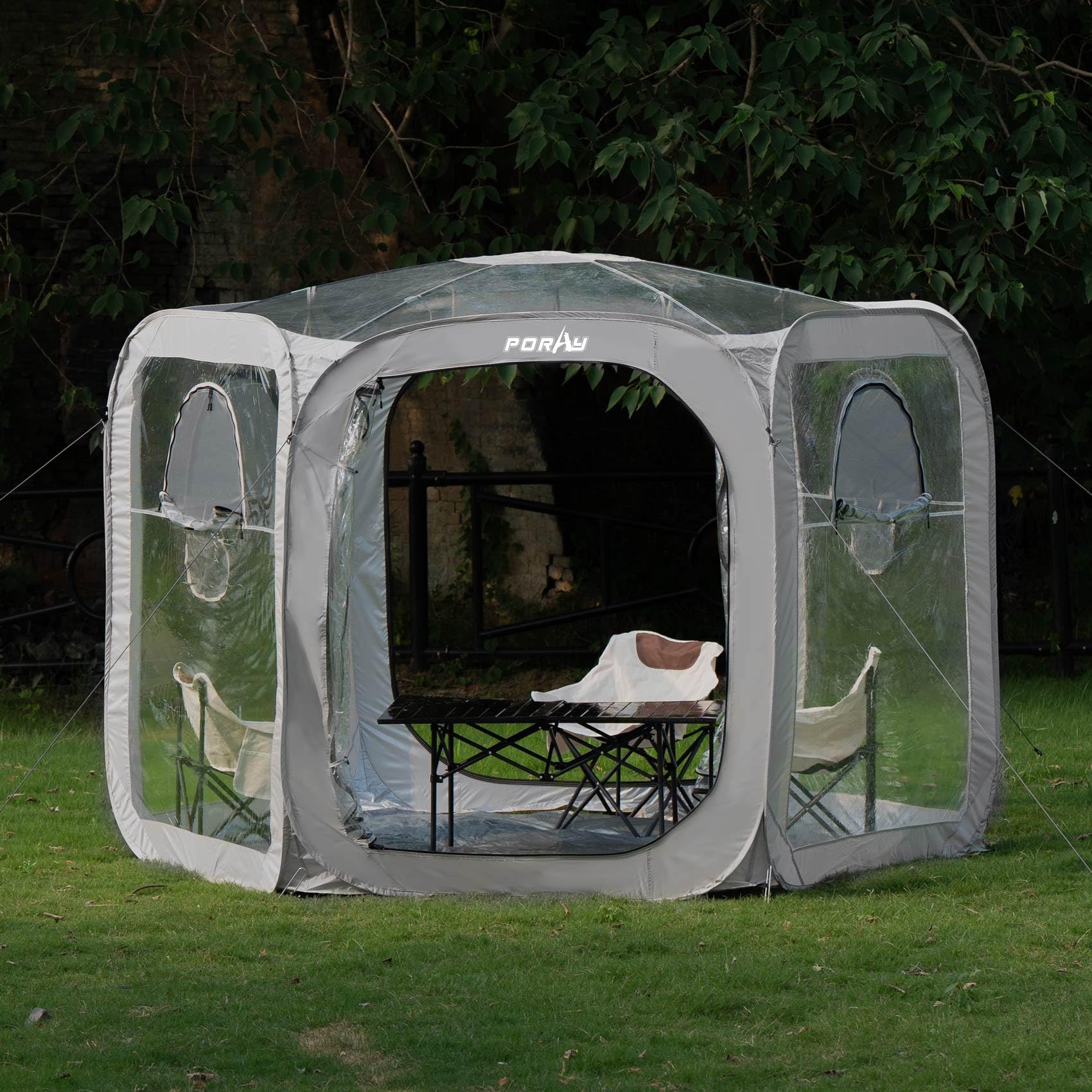 Lasting Durability & UV Defense - Crafted with heavy-duty Oxford fabric and transparent PVC, Our Porayhut 10x10 Pop up bubble tent delivers unmatched durability, waterproofing, and tear resistance. The silver-coated UV layer ensures superior sun protection, making this PVC Screen House ideal for extended camping trips, backyard lounging, or outdoor adventures. Stay shielded in style