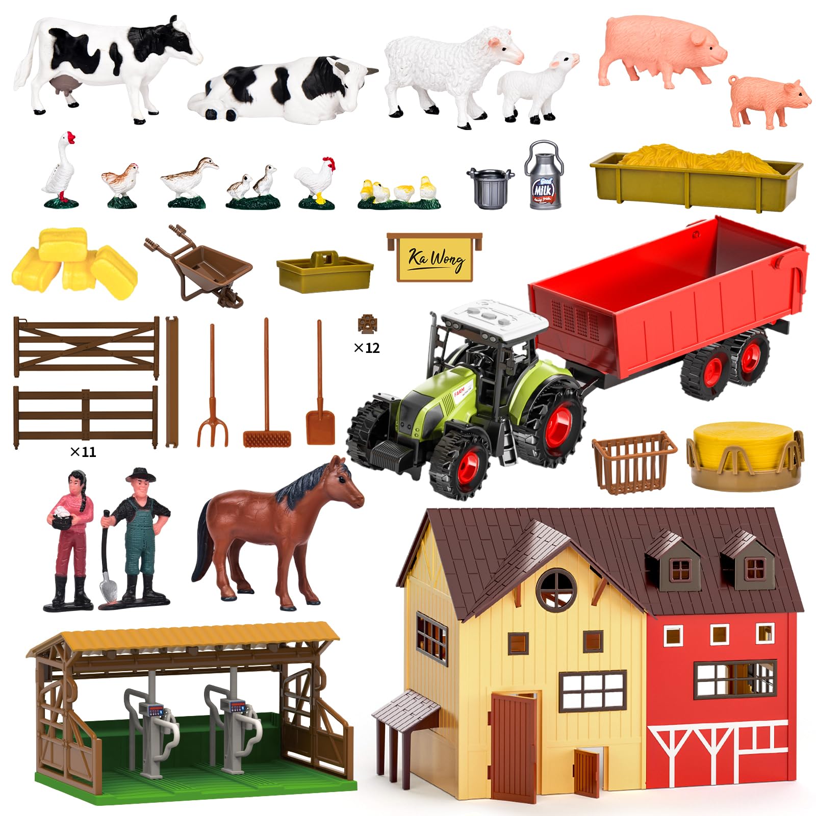 KIDS FARMHOUSE PLAYSET: This big farm toys set includes 1 tractor with trailer toy, 1 large animal house, 1 milk shed, 12 fence, 18 realistic farm animals (horse, cow, pig, sheep, chicken, ducks, and geese), 1 tree, hay bales and farming sets, etc. Recommended for children aged 3 and up, promotes imaginative play and is an exceptional screen-free play option.