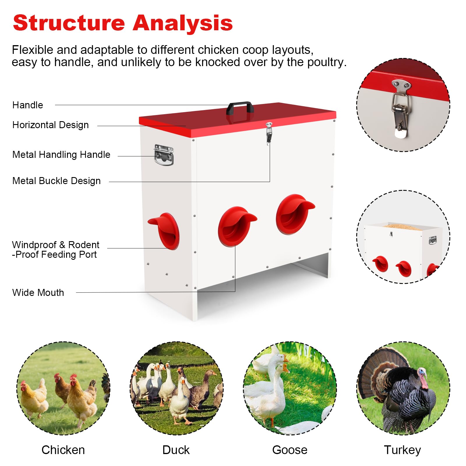 Large Capacity for Long-Term Feeding: Automatic chicken feeder has a capacity of up to 90 pounds, which can meet the continuous feeding needs for over 30 days. The 10-hole poultry feeder design enables multiple chickens to eat simultaneously, providing efficient feeding and reducing competition, significantly reducing the frequency of supplies, especially when you are away for a long time. It is very suitable for large chicken farms or backyard chicken coops.