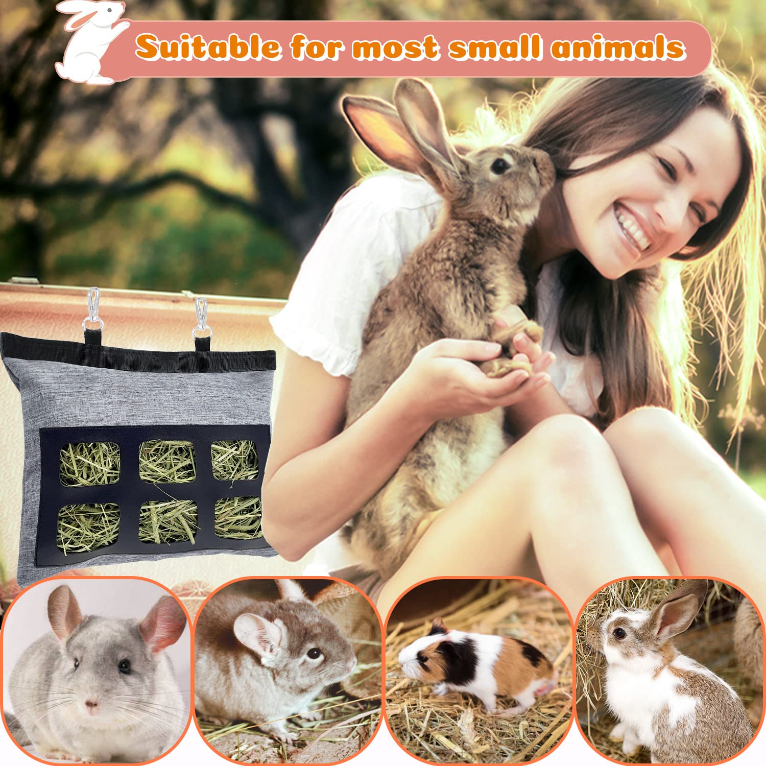 [Suitable for Various Small Animals]: The rabbit hay bags are also suitable for most small animals, such as guinea pigs, chinchillas, hedgehogs, bunny and pet pigs, making it an ideal hay feeder for small pets.