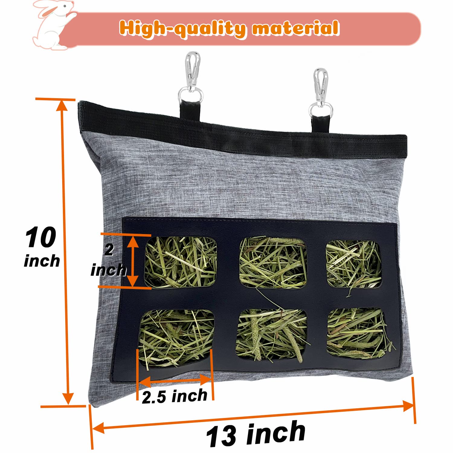 [Easy to Use]: Simply hang the hay feeder bag in the appropriate position in your bunnies' cage using the metal hooks provided. It is effortless to use and saves time.