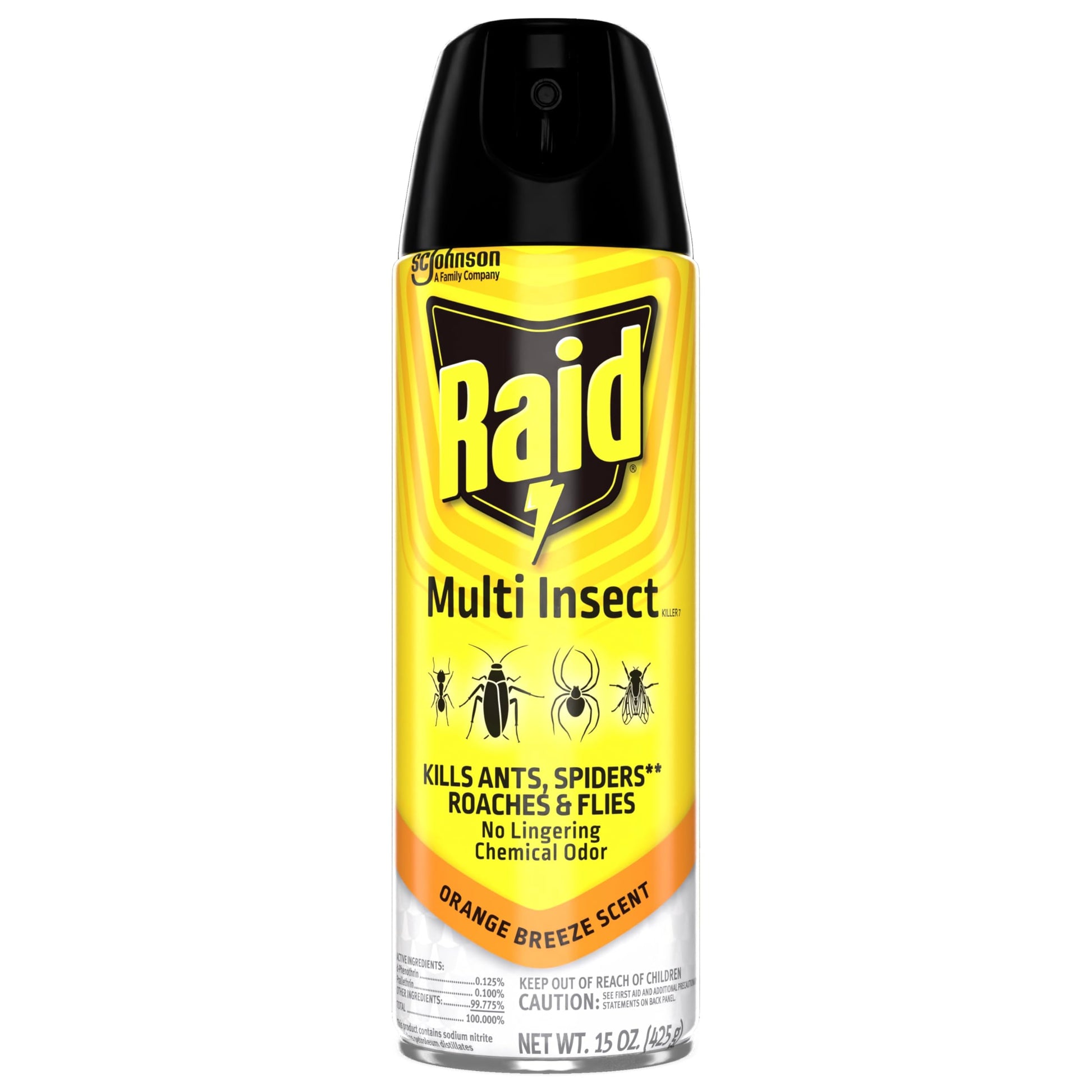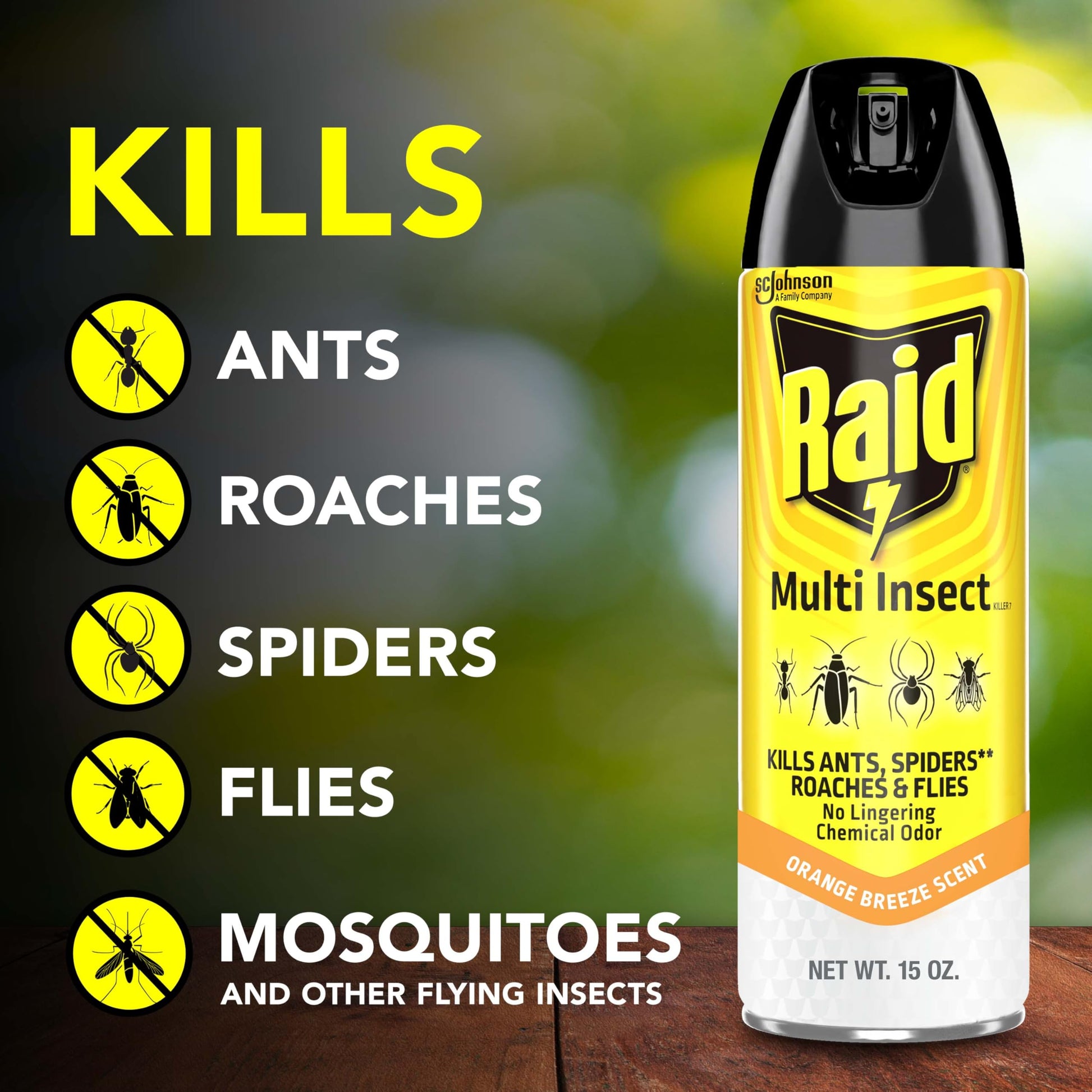 One 15 oz can of Raid Multi Insect Killer kills bugs on contact, including ants, Asian lady beetles, boxelder bugs, carpet beetles, crickets, firebrats, fleas, silverfish, flies, fruit flies, non-biting gnats, hornets, mosquitoes, roaches, and spiders (except brown recluse and black widow spiders)