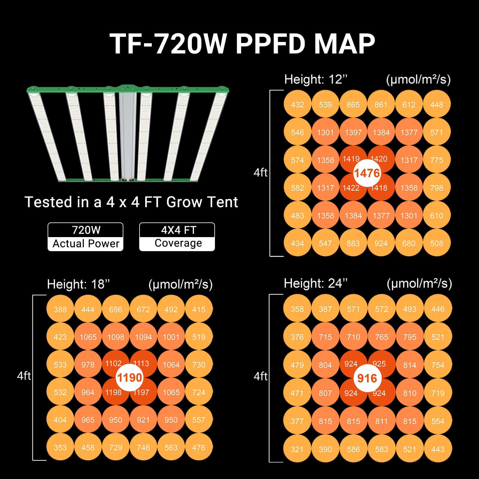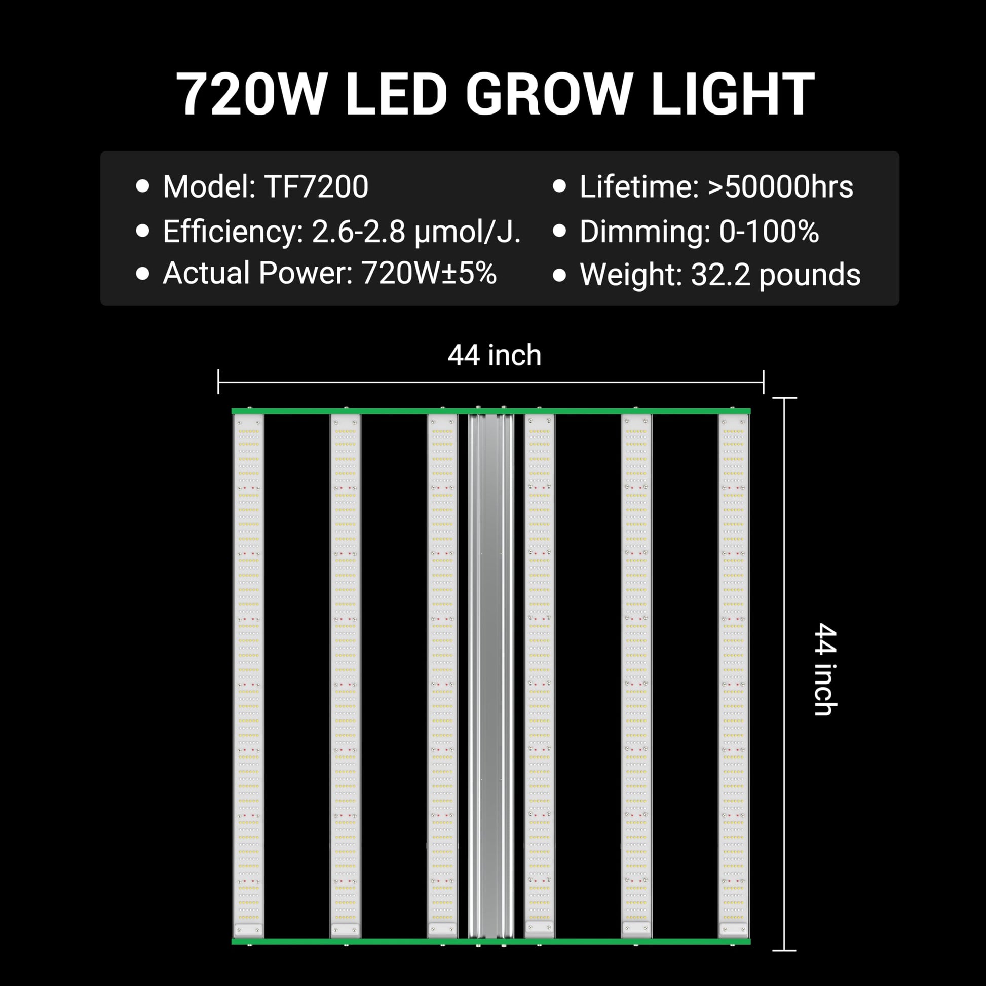 High-Quality 720W LED Grow Light: The grow light uses LM281B+ LED and EPI 660nm 45mil LED, providing high PAR output, high efficiency 2.6-2.8 umol/J, while improving light penetration. 44in x 44in is the light installation size, with RJ11/12 interface, use PMW signal to control the light