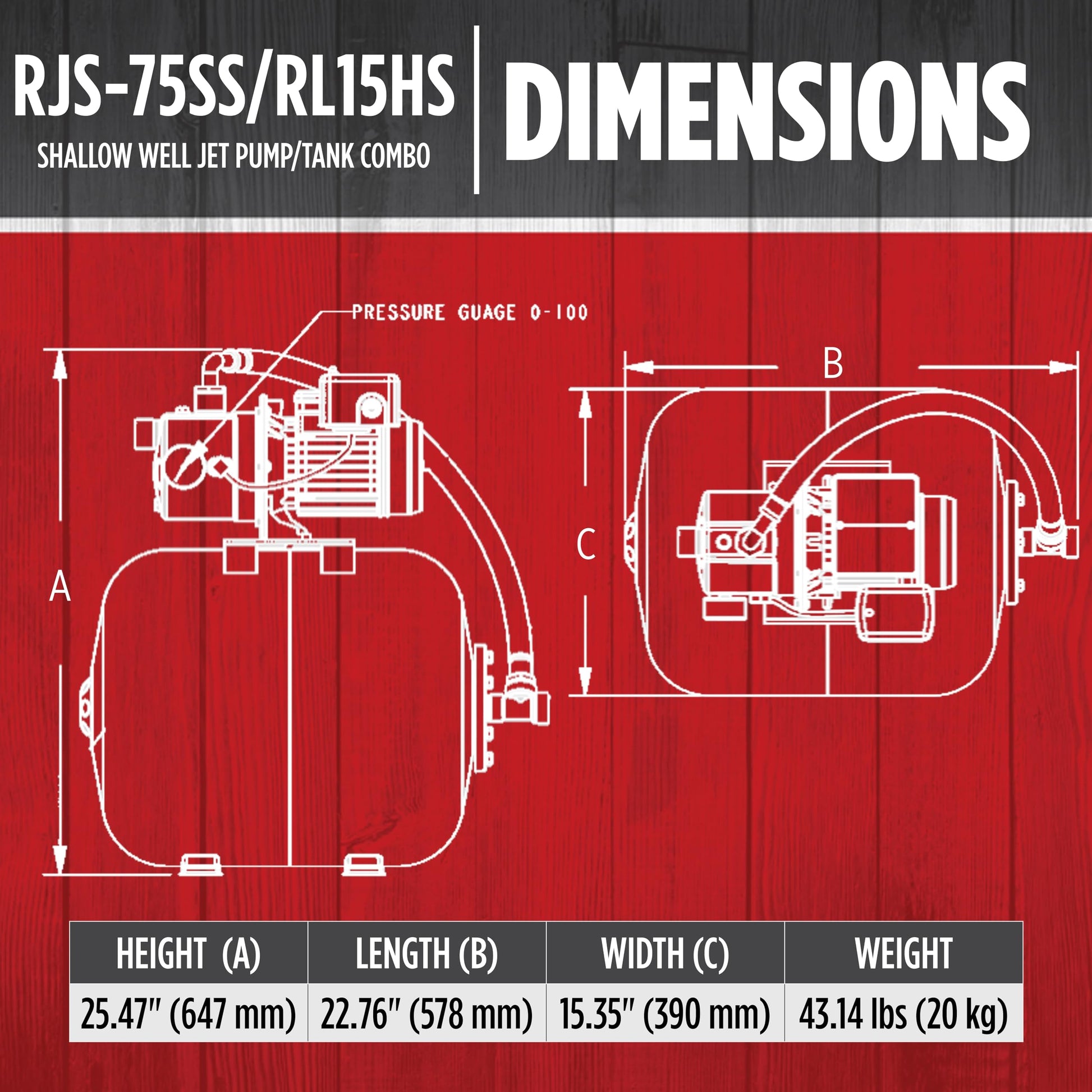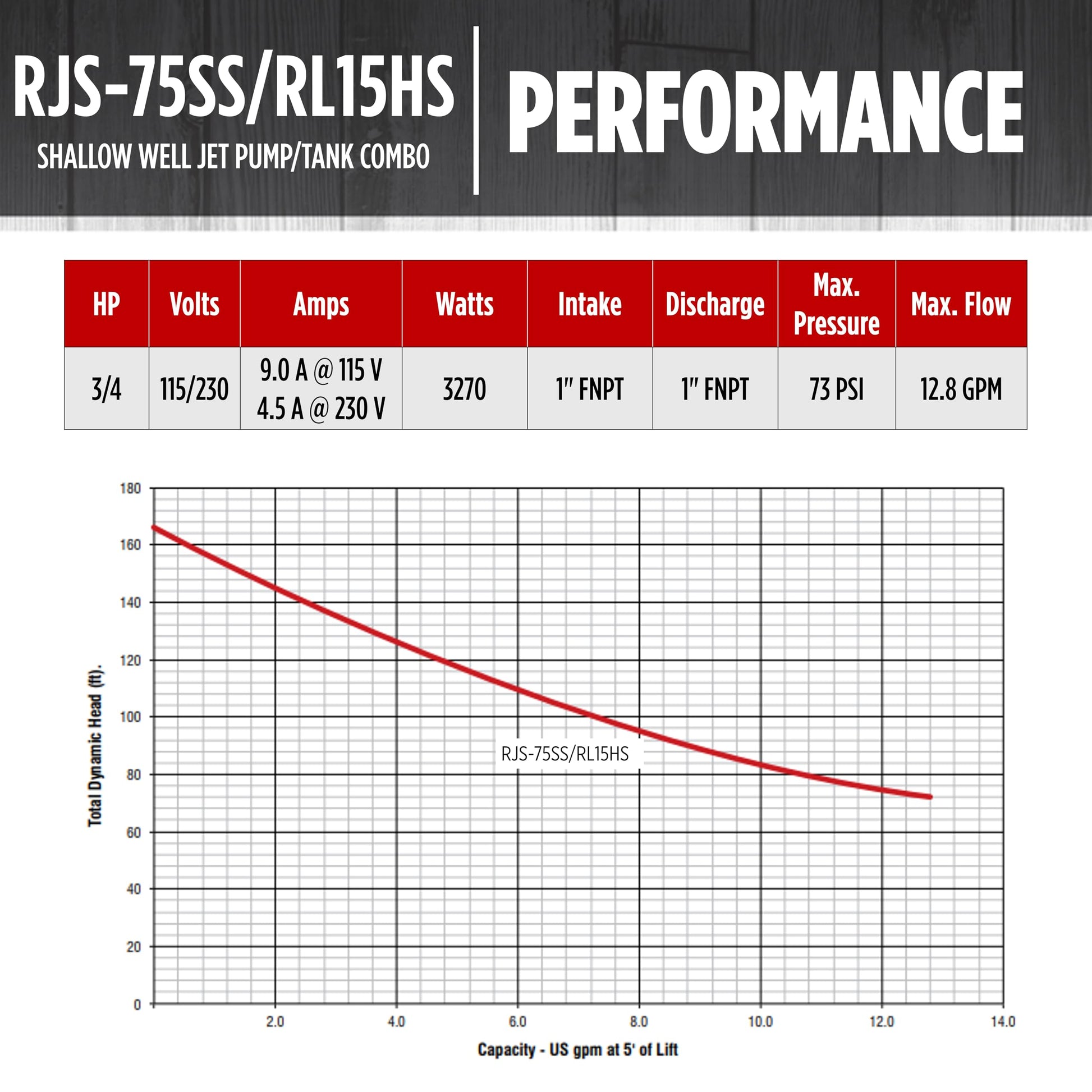 SPECIFICATIONS: 3/4 HP; 12.8 GPM at 30 PSI and 5-ft. suction lift; max pressure 73 PSI, 9.0 Amps at 115V; 4.5 Amps at 230 Volts; 3270 Watts, 15 gallon tank; max head 169-ft.; CSA listed in USA/Canada