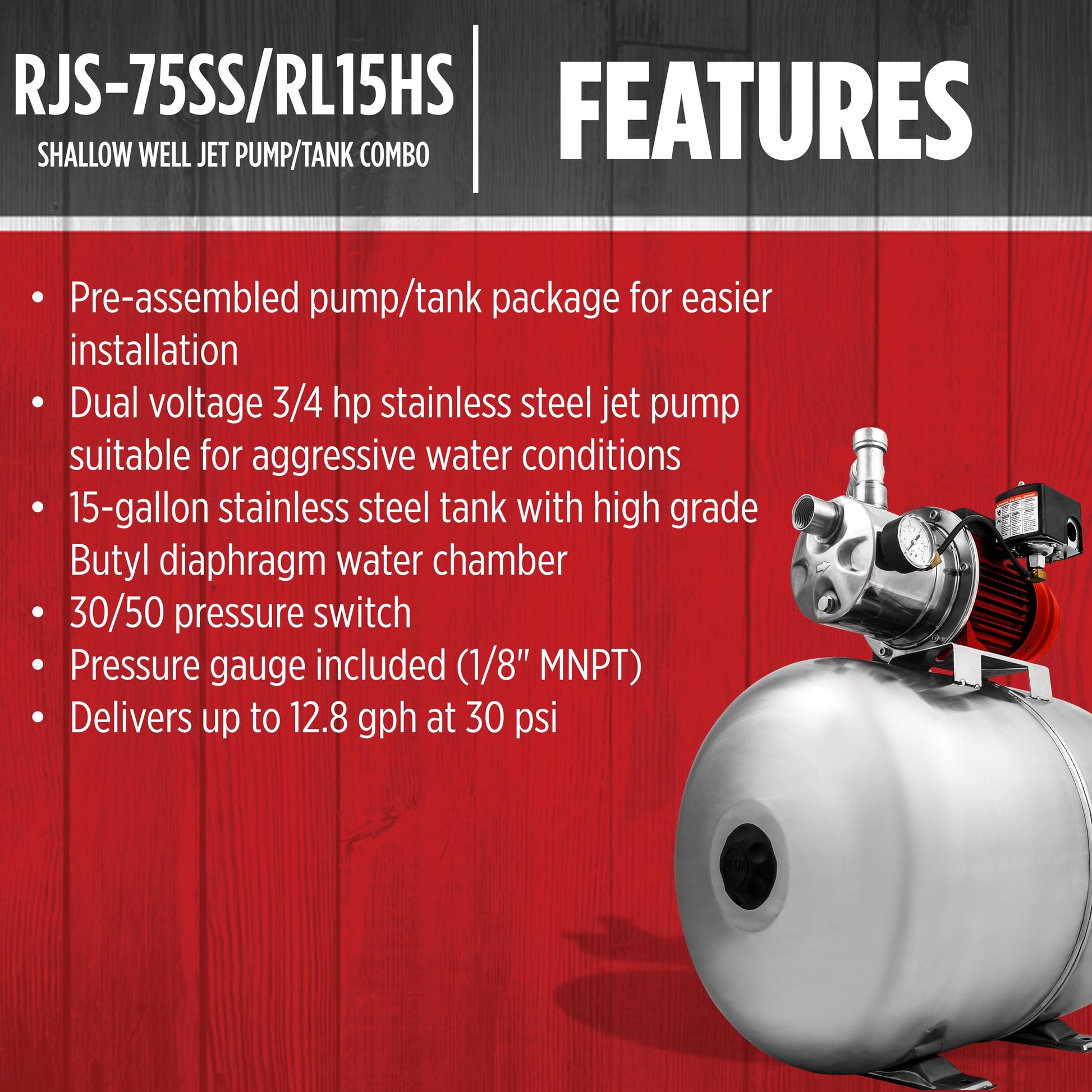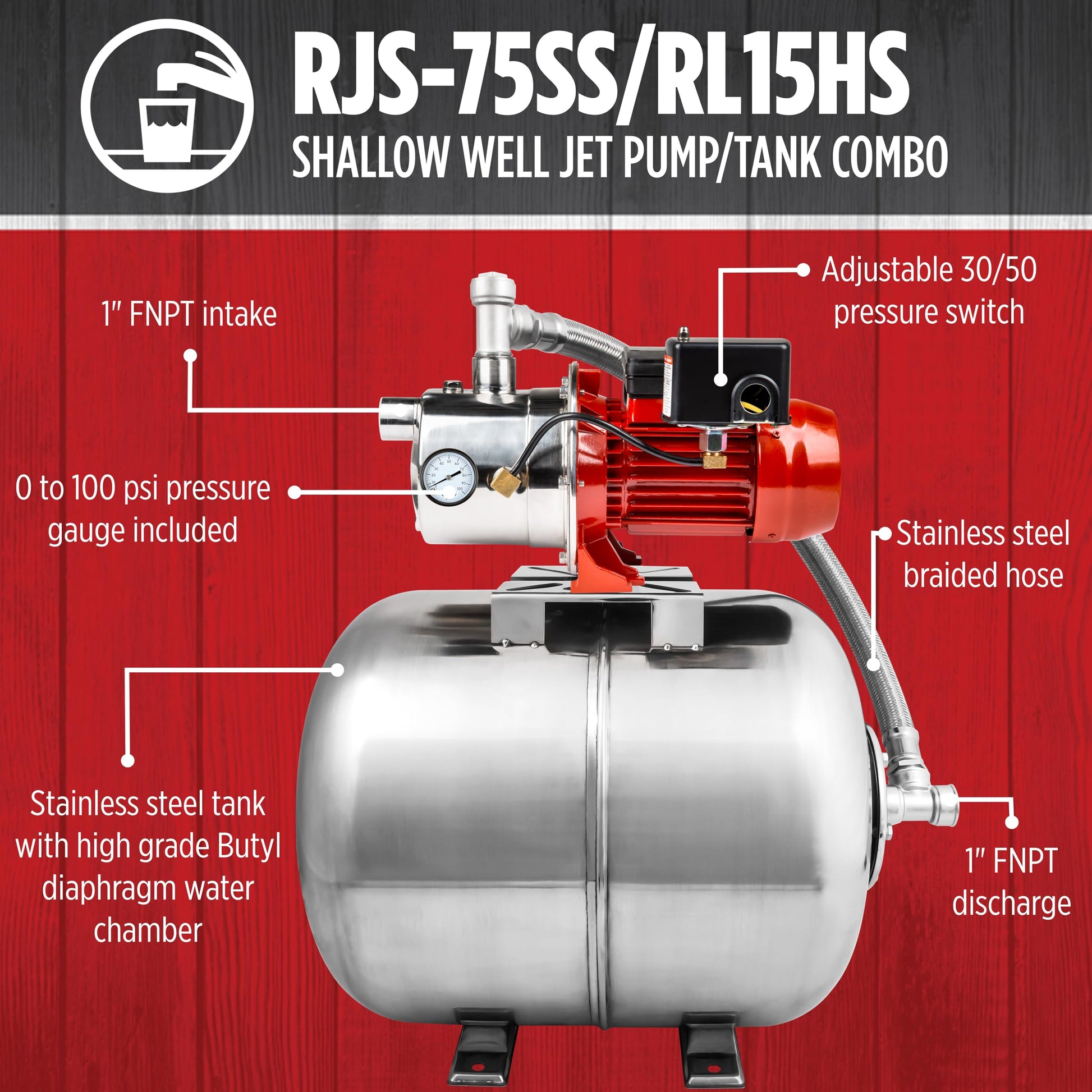 STAINLESS STEEL TANK AND PUMP CASING: more durable than cast iron and designed for aggressive water conditions; equipped with 1-inch FNPT threaded intake and discharge