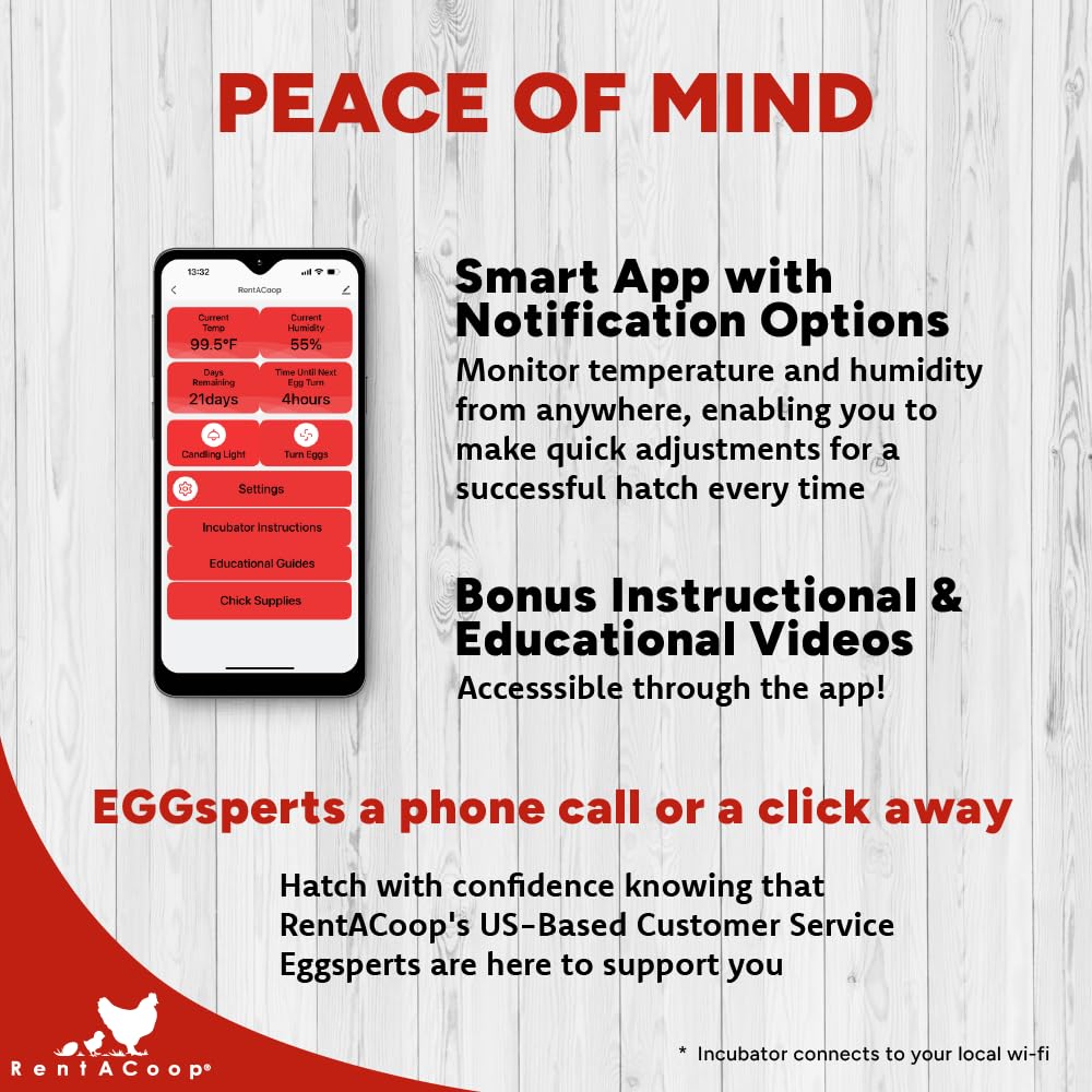 RentACoop Has a Solution! – Our 16-egg incubator, with presets for chickens, ducks, and quail eggs, or a custom option, maintains an optimal 99.5°F with less than 0.5°F fluctuation, ensuring a high hatch success rate. This high-tech incubator takes the stress out of hatching—track, control, and hatch with confidence!