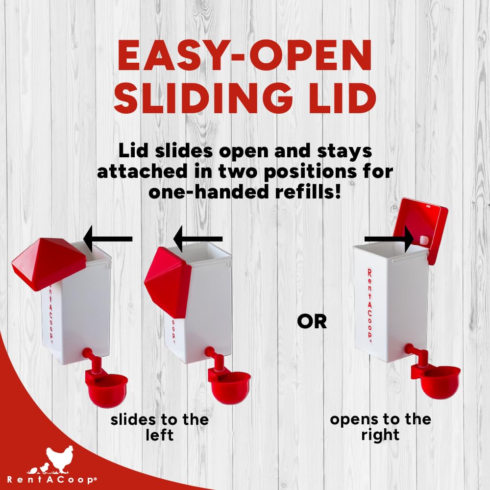 What's in the Box: One 32oz(1L) BPA-Free food-grade plastic waterer, sliding anti-roost lid, automatic refill drinking cup with elbow attachment, cup insert, universal fit spring clip, and instructions