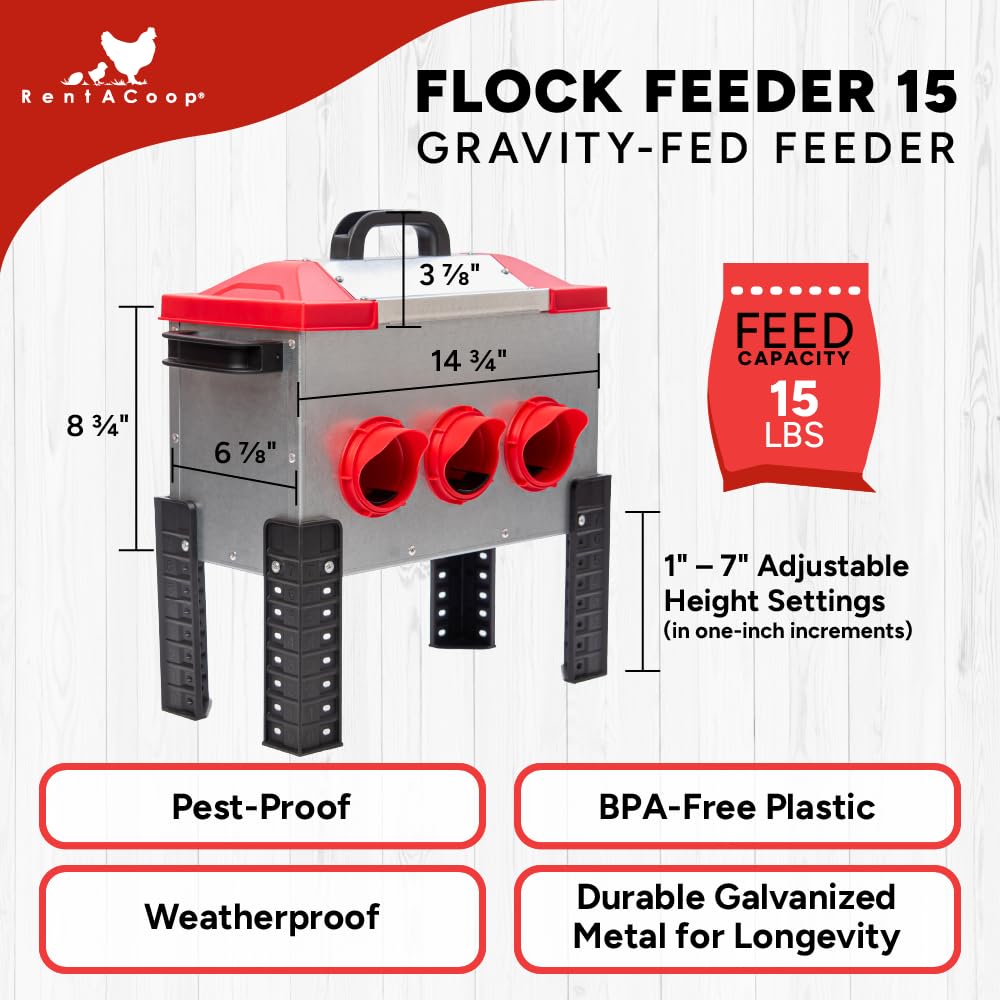 RentACoop Flock Feeder 15 Metal Chick2Chicken Feeder – Space-Saving Weatherproof Poultry Feeder with 6 Ports, Adjustable Legs, Rain Covers for Chicks, Chickens, Quail, Bantams, and Other Small Birds