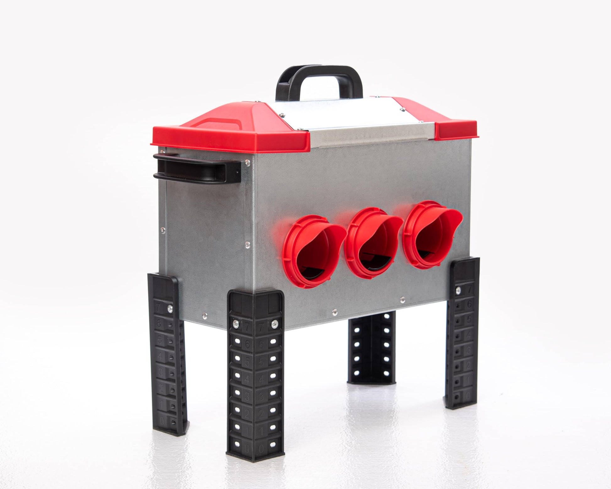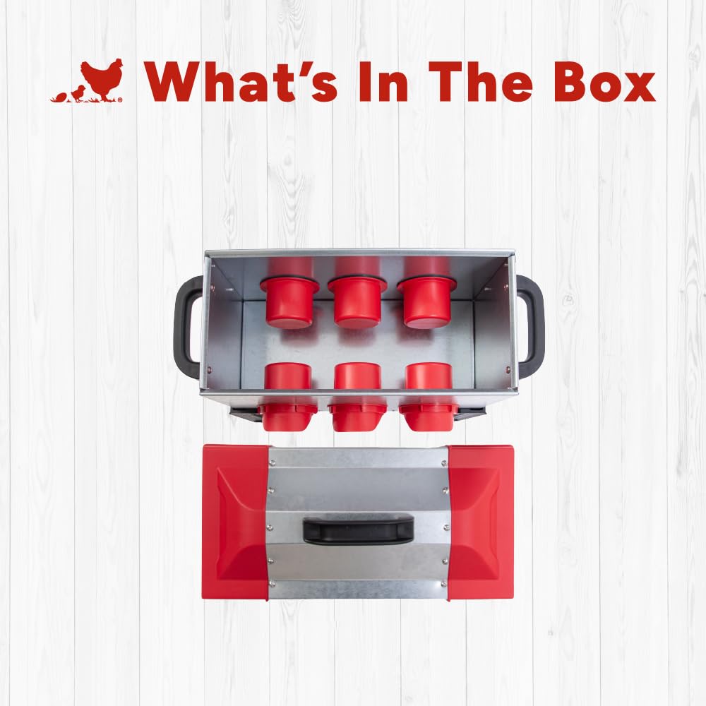 What’s in the Box? | One (1) RentACoop Flock Feeder 15; Six (6) Medium Chick2Chicken Ports with Rain Hoods; Two (2) Feed Diverters; Two (2) Handles; One (1) Peaked Lid with Handle; Four (4) Adjustable Legs; Instructions