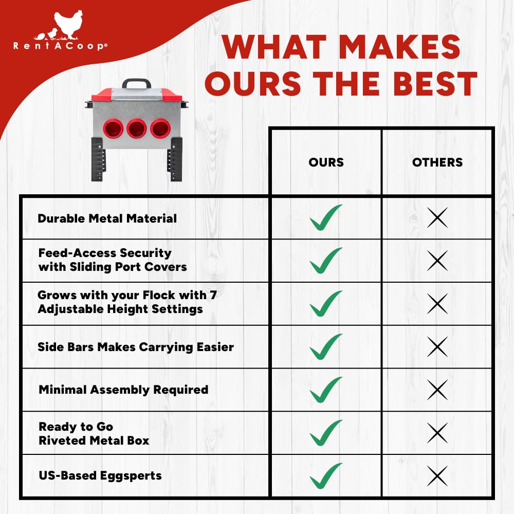 Why You'll Love It! | Compact, freestanding feeder holds 15 Lbs. of pellets, crumble, or scratch grains; Adjustable height, perfect for all ages and breeds; Easy to Assemble; Weather-proof and can be placed anywhere!