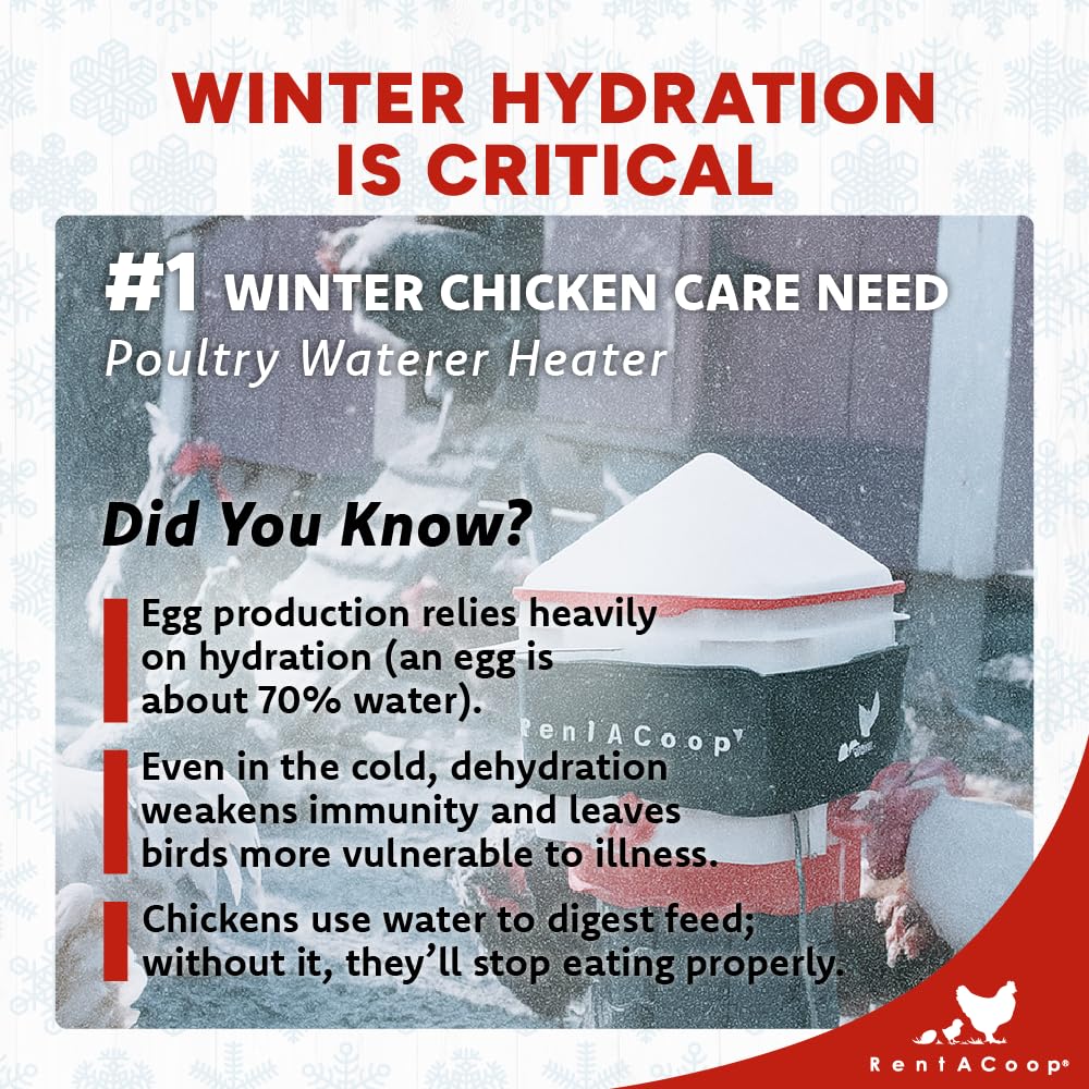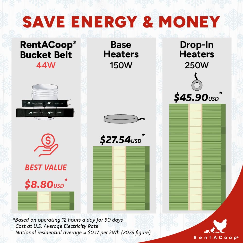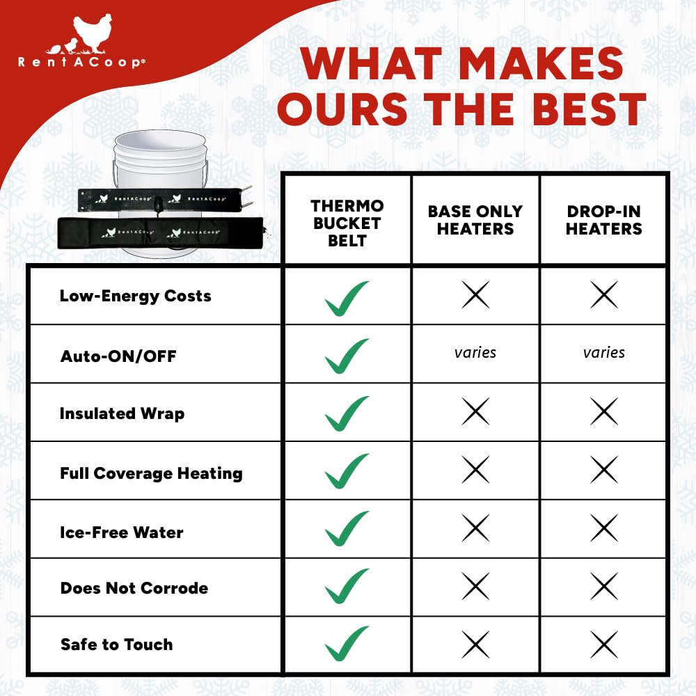 RentACoop has a solution! | Our ALL NEW Thermo Bucket Belt automatically maintains unfrozen water for your flock when the temperatures dip below 38 degrees F, and turns off above 42 degrees. No need for manual activation; peace of mind all winter long!