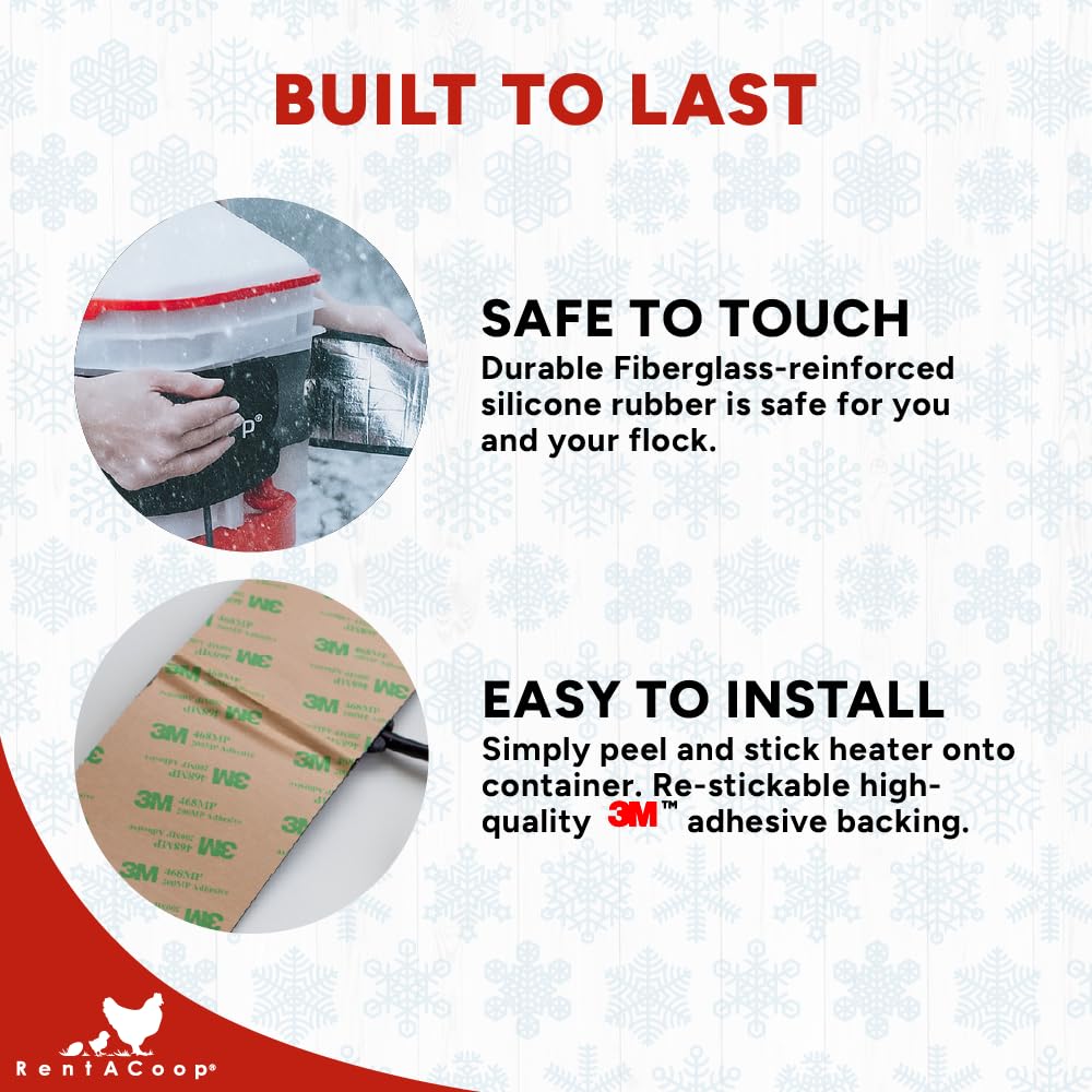 We thought of everything! | Versatile use for any shape 2 to 5 gallon bucket. Innovative design wraps fully around your chicken waterer to ensure even heating, and stays in place with repositionable adhesive backing. Compact for easy storage