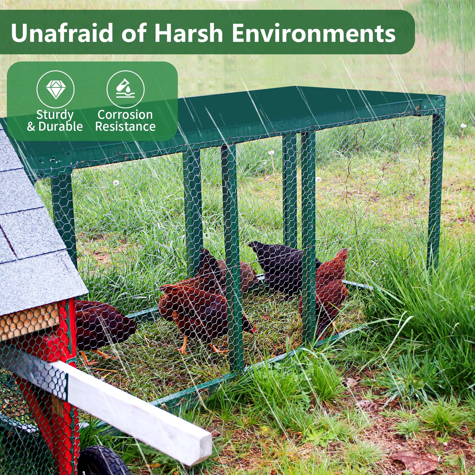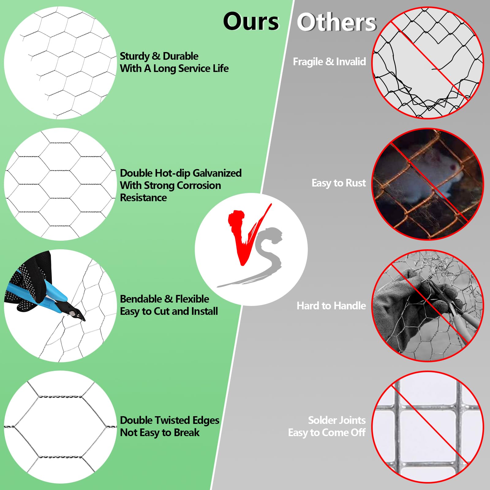 【Strong Protection】Compared with nylon or fabric or plastic mesh, galvanized chicken wire fencing is designed with double twisted hexagonal so that is more sturdy and more resilient, will not be easily torn by animals. Never again worry about your poultry, vegetables, fruits and flowers being harmed by rabbits, squirrels, deer, cats, dogs, hawks, raccoons, skunks, foxes and other animals.