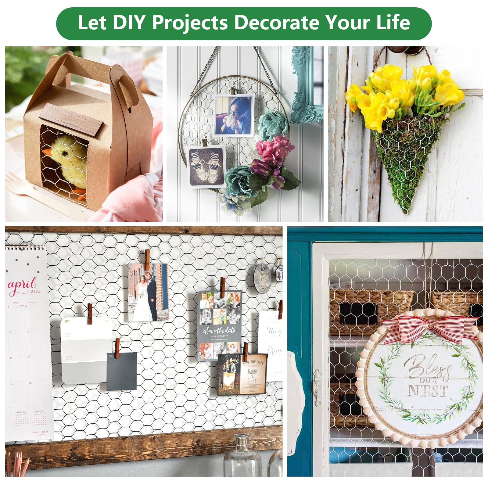 【Perfect for DIY Crafts】Chicken wire for crafts has good plasticity, the ideal material for making various DIY crafts. Many decorative projects can be made with chicken wire fencing, such as jewelry holders, Photo walls, photo frames, Christmas wreath frames, pantry doors, flower pots, cages, decorative fences, etc.