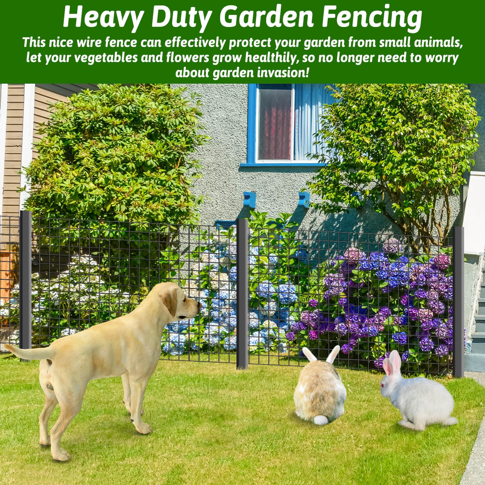 【59Ft×24In Garden Fence Set】ROADPLIUM garden fence set includes 1 roll of 59ft(L)×24in(H) black vinyl coated metal wire fence rolls, 15pcs U-shape garden nails, 100pcs zip ties, 1 pair of scissors, 1 pair of gloves. Enough fencing length and practical accessories make you easy to decorate and protect your garden