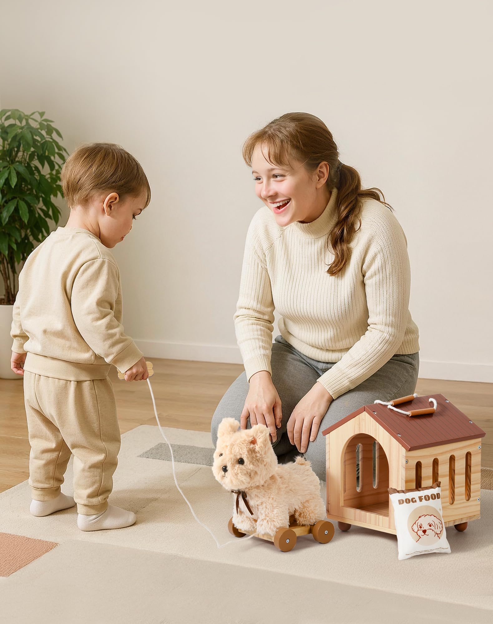 ROBOTIME Pull Dog Toy for Toddlers, Puppy Pet Care Pretend Play Set with Stuffed Animal, Dog House & Accessories, Walking Pull Along Toy, Educational Plush Gift for Boys and Girls