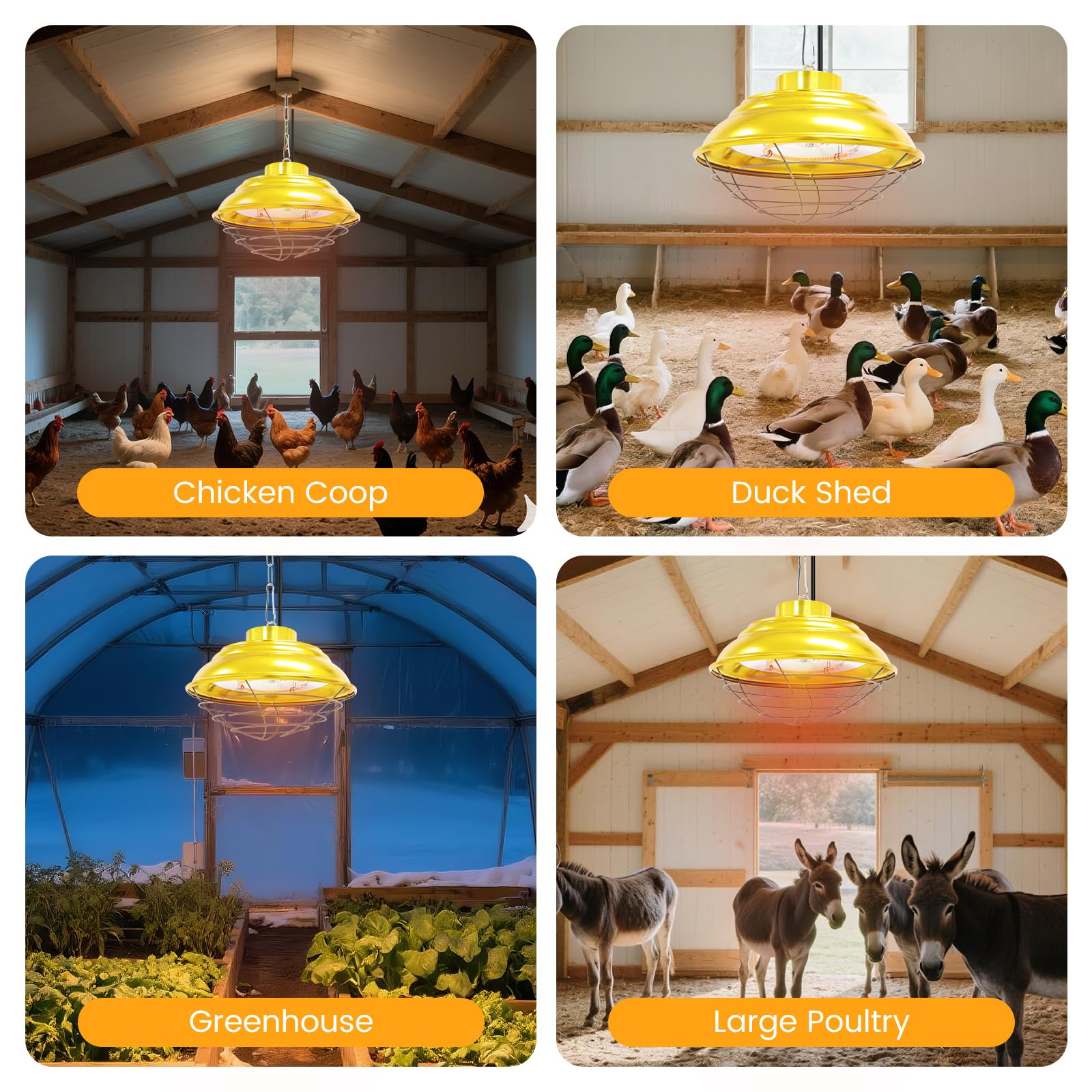 Multiple uses: This big heater is widely used in poultry, such as chicken coop, turkey, duck, goose, pet house, cattle, horses, donkeys, sheep, other large poultry etc.