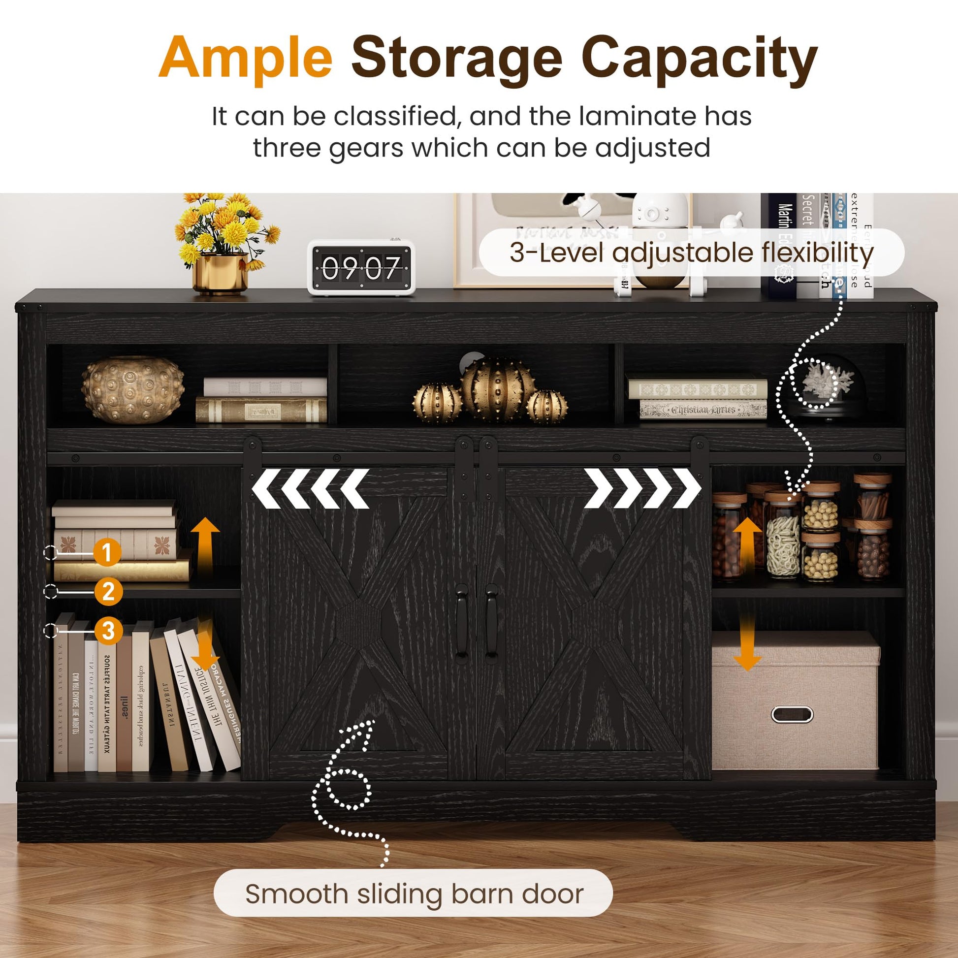 Maximize Storage with Our Fireplace TV Stand: The overall size is 58" W x 34" H x 16"D. The spacious tabletop holds it all, while 3 top-tier compartments keep things organized. Adjustable shelves on both sides offer 3 height options for different-sized items. Neatly tuck wire away through discreet holes.