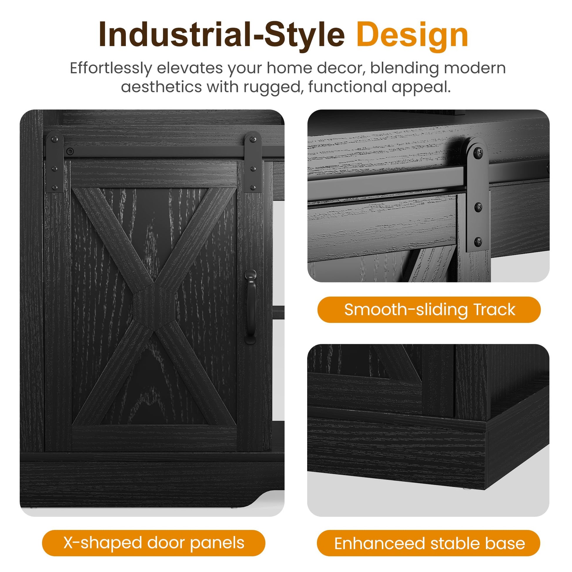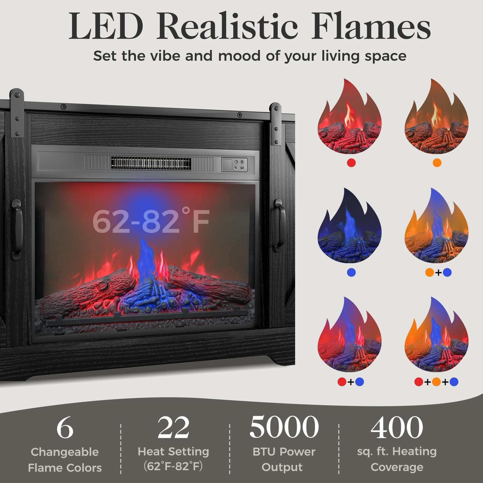 Why Fireplace or TV Stand When You Can Have Both? : Imagine a cozy evening by the fireplace entertainment center. No mess, no wood chopping—just farmhouse elegance with sliding barn door and authentic wood textures, bathed in the warm flicker of firelight.
