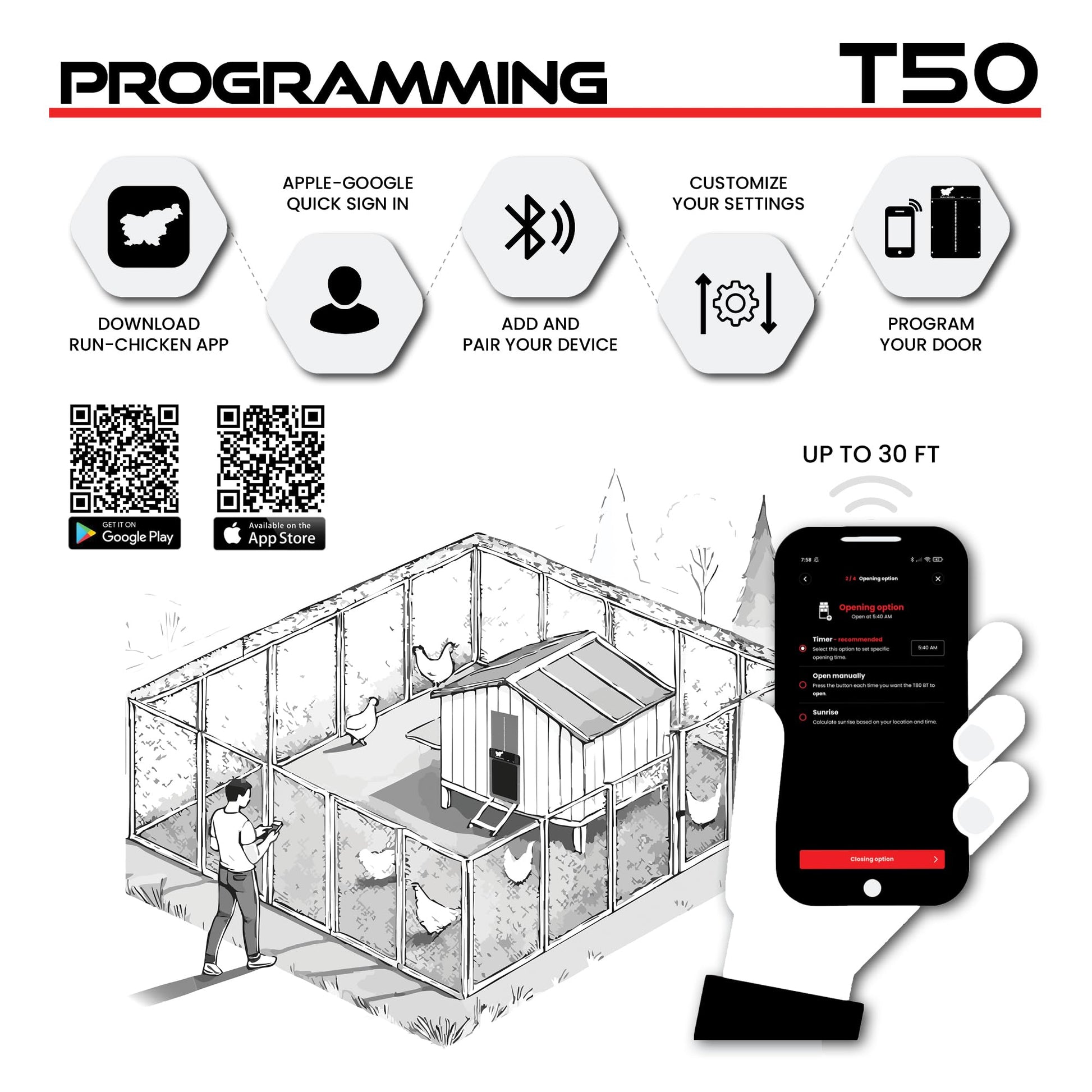 Easily Programmable - Configure with use phone app. Chicken door automatically opens in the morning and closes in the evening. No more waking up early in the morning. You can set the Timer, Light Sensor, GPS mode or Manually configure to your needs.