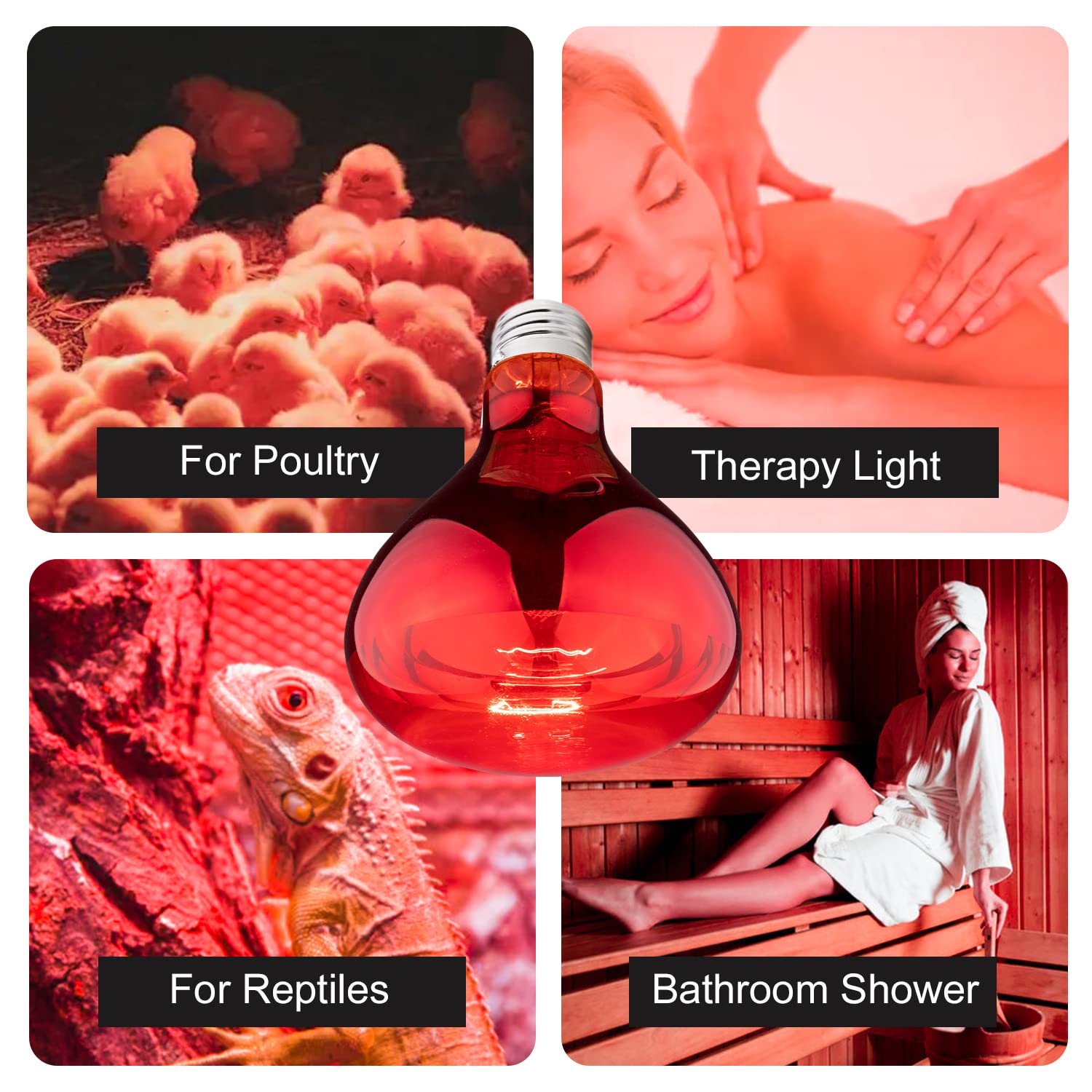 【WIDE APPLICATION】Infrared heat bulbs is ideal for residential bathroom application, red heat lamp used In recessed light fixtures in Showers to heat your bathroom after showers, food service.and great for reptiles or amphibians,besides infrared bulb can be used as a heat lamp for chicken puppies incubate.