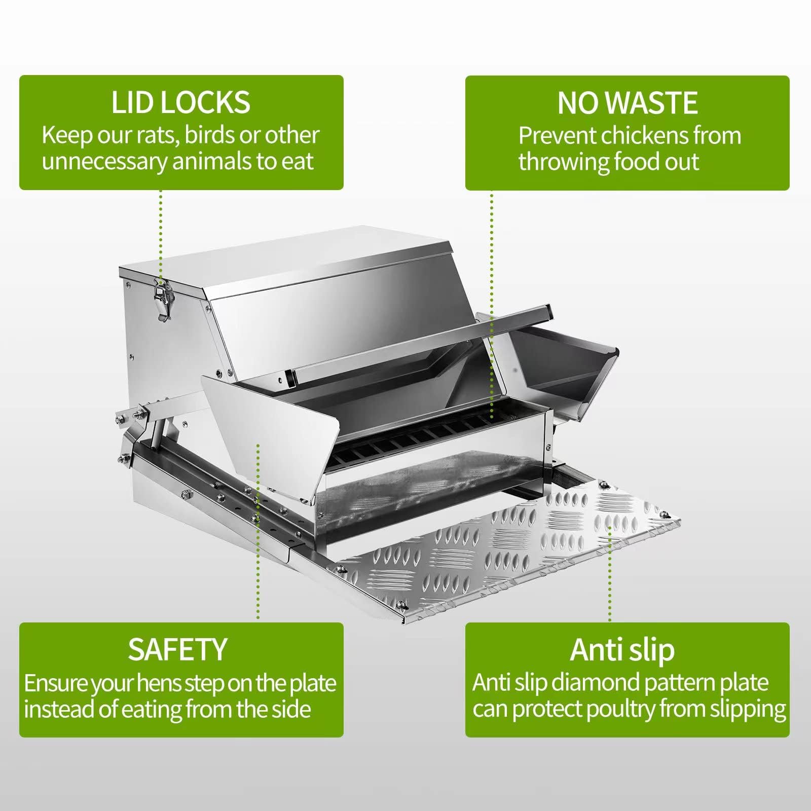 [Reliable design] Made of high-quality galvanized steel, it can withstand extreme outdoor conditions and provide excellent rust prevention and waterproof performance.The anti slip diamond pattern plate protects poultry from slipping.