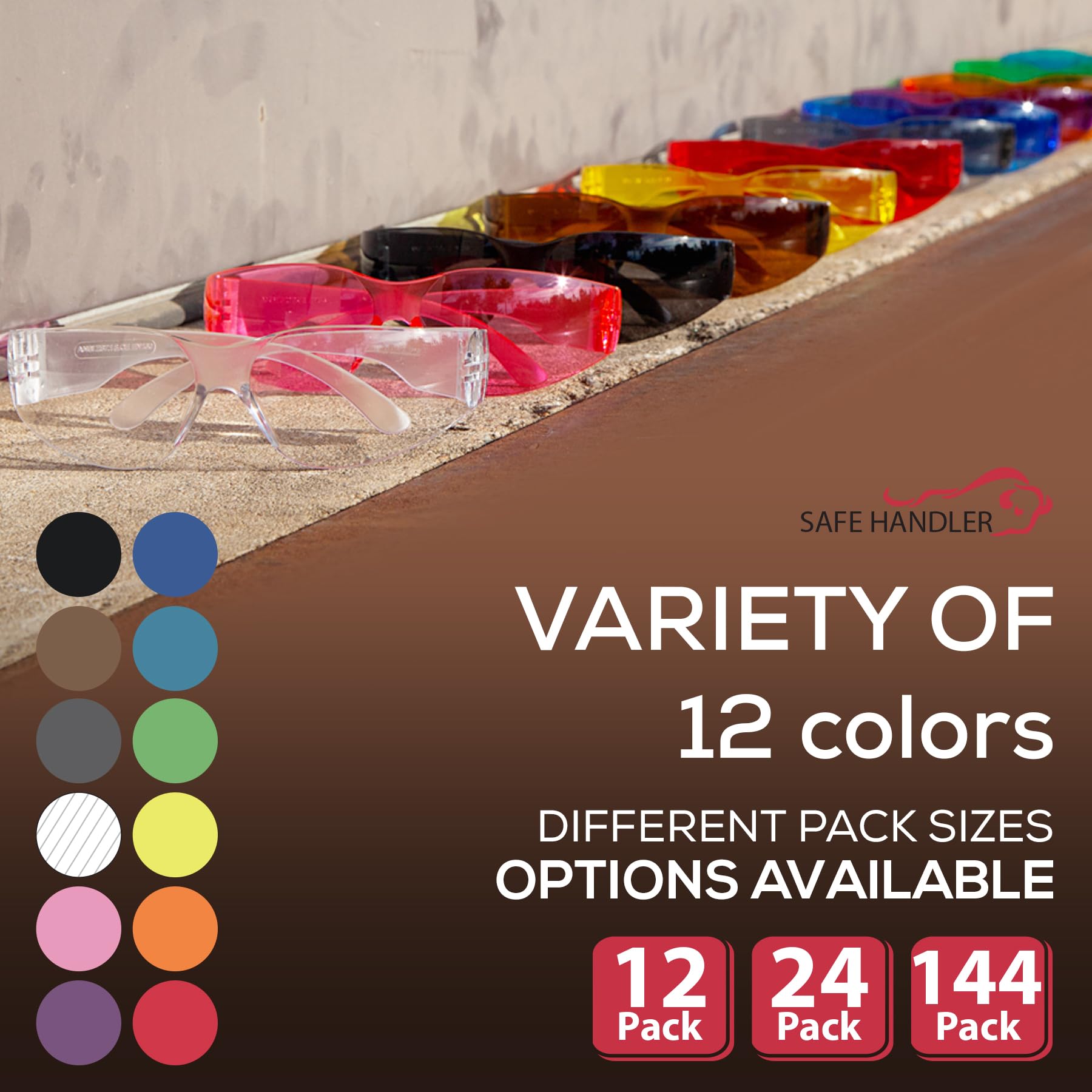 SAFE HANDLER by Bison Life - Hyline Safety Glasses, Color Lens, Color Temple, 12 assorted colors in one box, 1 of each color: pink, red, orange, yellow, purple, green, black, turquoise, grey, blue, brown, clear